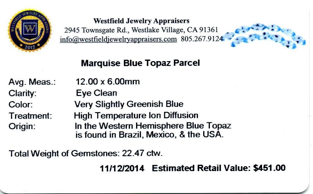 22.47ctw. Marquise Blue Topaz Parcel. Westfield Appraised at $451.00.