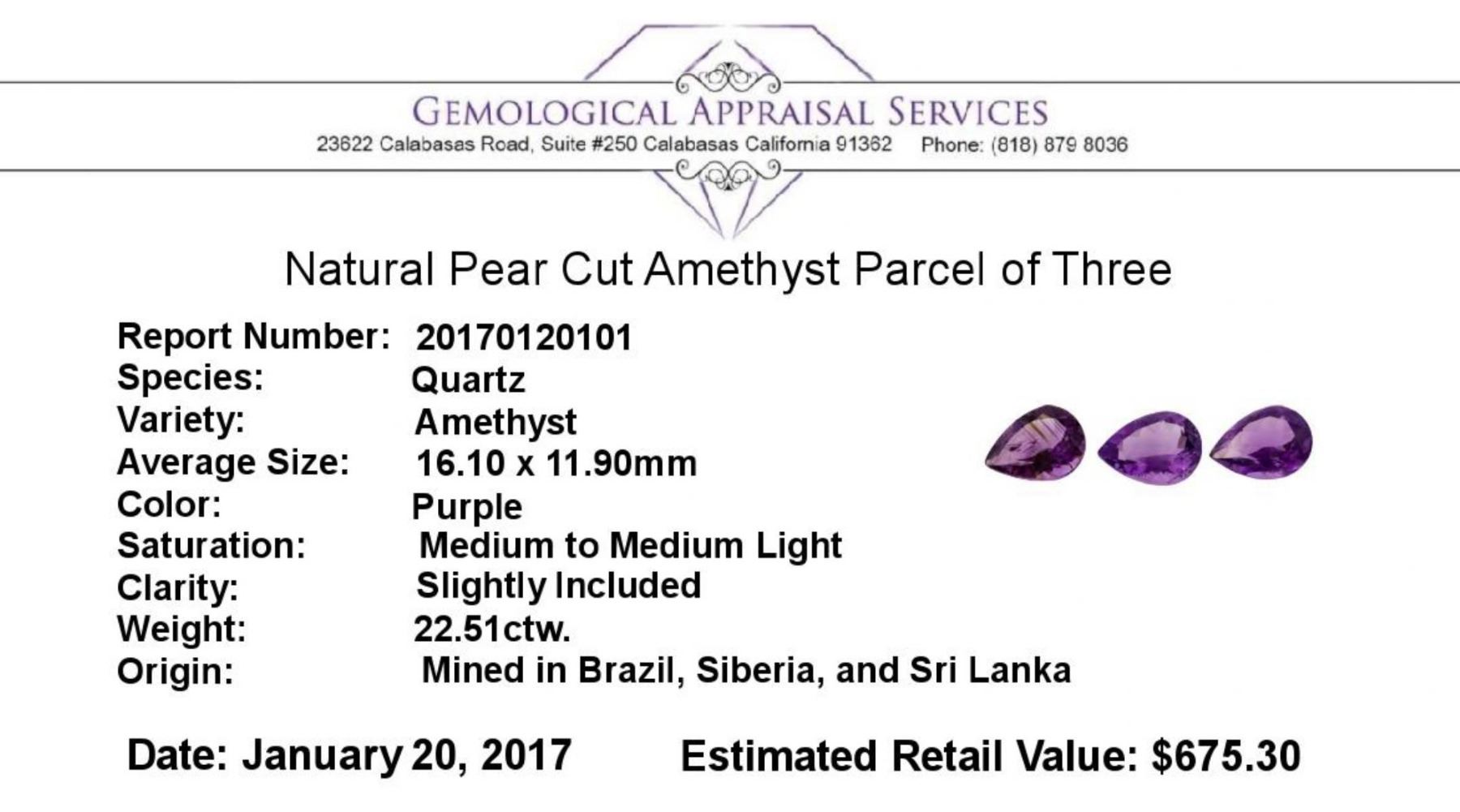 One natural pear cut amethyst parcel of three with an exact weight of 22.51ctw., clarity is slightly included, purple, medium to medium light. Gemological Appraisals Services estimates the retail value at $675.3 GAS Appraised.