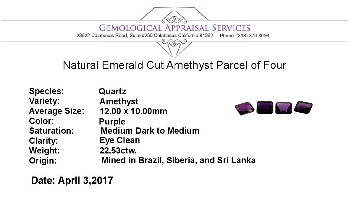 One natural emerald cut amethyst parcel of four with an exact weight of 22.53ctw., clarity is eye clean, purple, medium dark to medium. Gemological Appraisals Services estimates the retail value at $675.9 GAS Appraised.