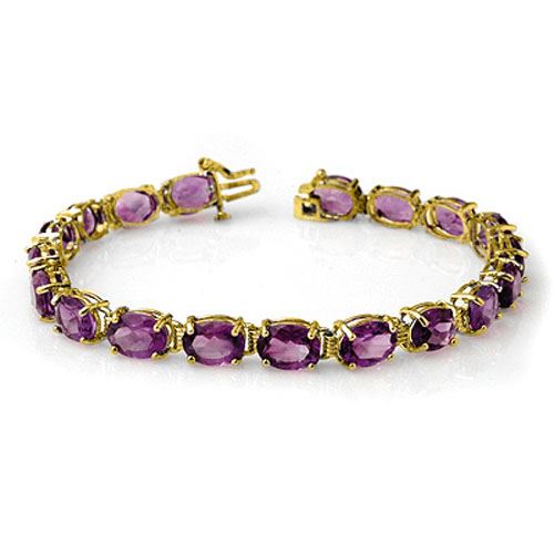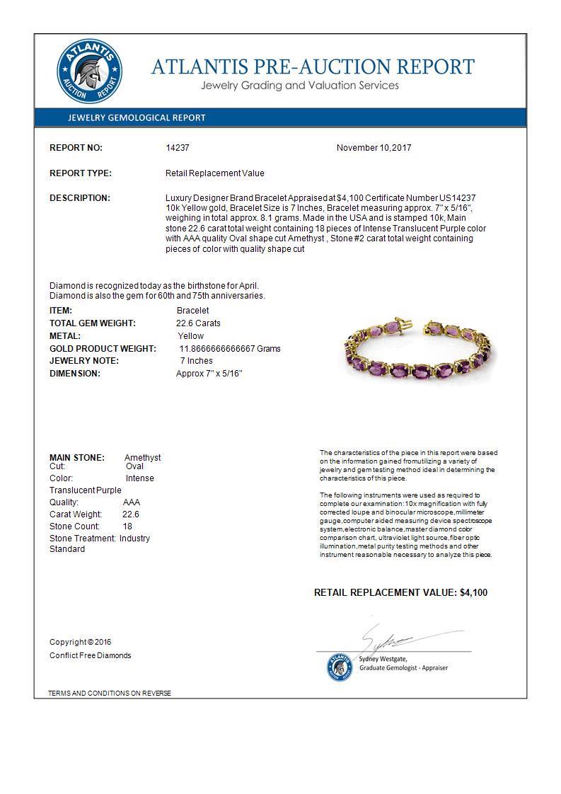 14237 - REF-57M6F ---- 22.60 CTW Amethyst Bracelet 10K Yellow Gold ---- Luxury Designer Brand Bracelet Appraised at $4,100 Certificate Number US14237 10k Yellow gold, Bracelet Size is 7 Inches, Bracelet measuring approx. 7" x 5/16", weighing in total approx. 8.1 grams. Made in the USA and is stamped 10k, Main stone 22.6 carat total weight containing 18 pieces of Intense Translucent Purple color with AAA quality Oval shape cut Amethyst , Stone #2 carat total weight containing pieces of color with quality shape cut