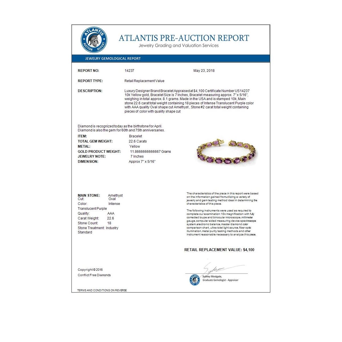 REF-57N6Y -14237 ---- 22.60 CTW Amethyst Bracelet 10K Yellow Gold ---- Luxury Designer Brand Bracelet Appraised at $4,100 Certificate Number US14237 10k Yellow gold, Bracelet Size is 7 Inches, Bracelet measuring approx. 7" x 5/16", weighing in total approx. 8.1 grams. Made in the USA and is stamped 10k, Main stone 22.6 carat total weight containing 18 pieces of Intense Translucent Purple color with AAA quality Oval shape cut Amethyst , Stone #2 carat total weight containing pieces of color with quality shape cut