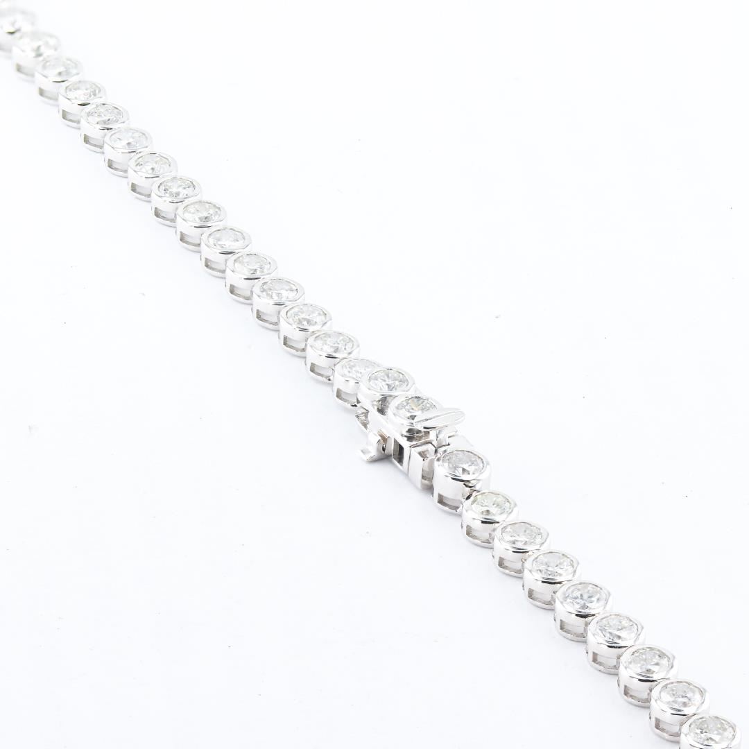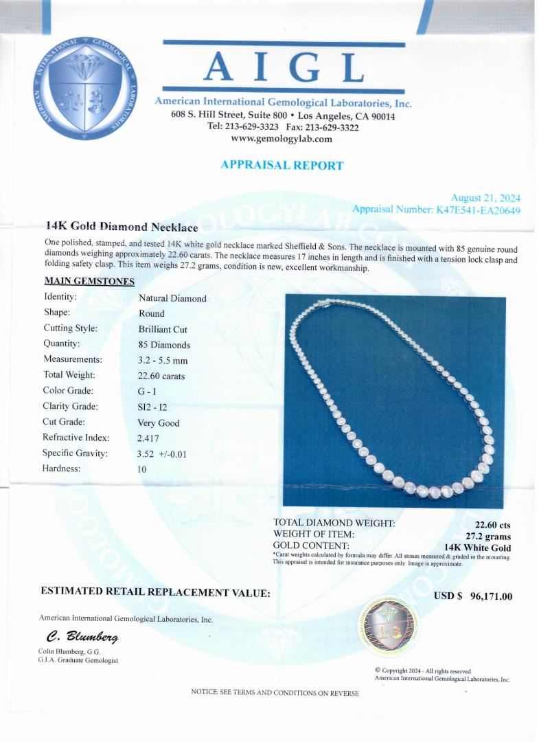 One polished, stamped, and tested 14K white gold necklace marked Sheffield & Sons. The necklace is mounted with 85 genuine round diamonds weighing approximately 22.60 carats. The necklace measures 17 inches in length and is finished with a tension lock clasp and folding safety clasp. This item weighs 27.2 grams, condition is new, excellent workmanship #MAIN GEMSTONES# Identity: Natural Diamond Shape: Round Cutting Style: Brilliant Cut Quantity: 85 Diamonds Measurements: 3.2 - 5.5mm Total Weight: 22.60 carats Color Grade: G-I Clarity Grade: SI2-I2 Cut Grade: Very Good Refractive Index: 2.417 Specific Gravity: 3.52 +/-0.01 Hardness: 10 TOTAL DIAMOND WEIGHT: 22.60 cts WEIGHT OF ITEM: 27.2 grams GOLD CONTENT: 14K White Gold Size: 17