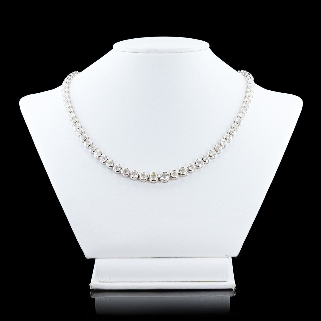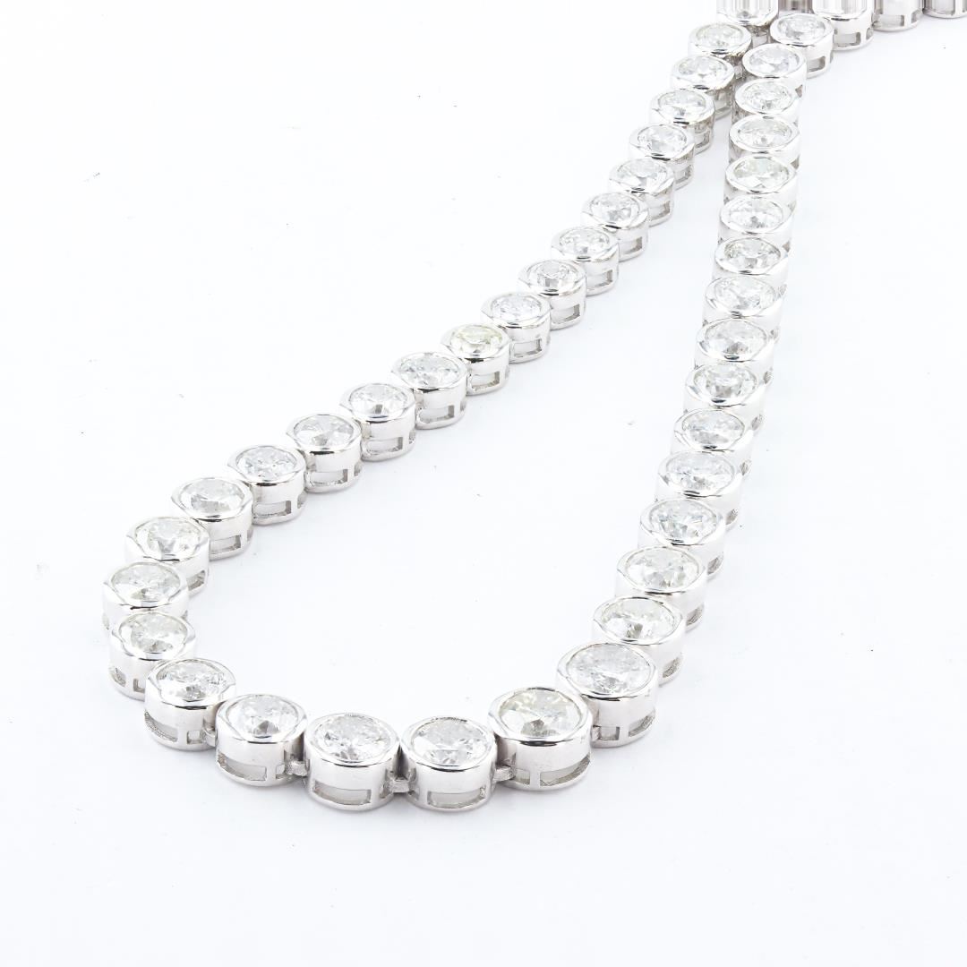 One polished, stamped, and tested 14K white gold necklace marked Sheffield & Sons. The necklace is mounted with 85 genuine round diamonds weighing approximately 22.60 carats. The necklace measures 17 inches in length and is finished with a tension lock clasp and folding safety clasp. This item weighs 27.2 grams, condition is new, excellent workmanship #MAIN GEMSTONES# Identity: Natural Diamond Shape: Round Cutting Style: Brilliant Cut Quantity: 85 Diamonds Measurements: 3.2 - 5.5mm Total Weight: 22.60 carats Color Grade: G-I Clarity Grade: SI2-I2 Cut Grade: Very Good Refractive Index: 2.417 Specific Gravity: 3.52 +/-0.01 Hardness: 10 TOTAL DIAMOND WEIGHT: 22.60 cts WEIGHT OF ITEM: 27.2 grams GOLD CONTENT: 14K White Gold Size: 17