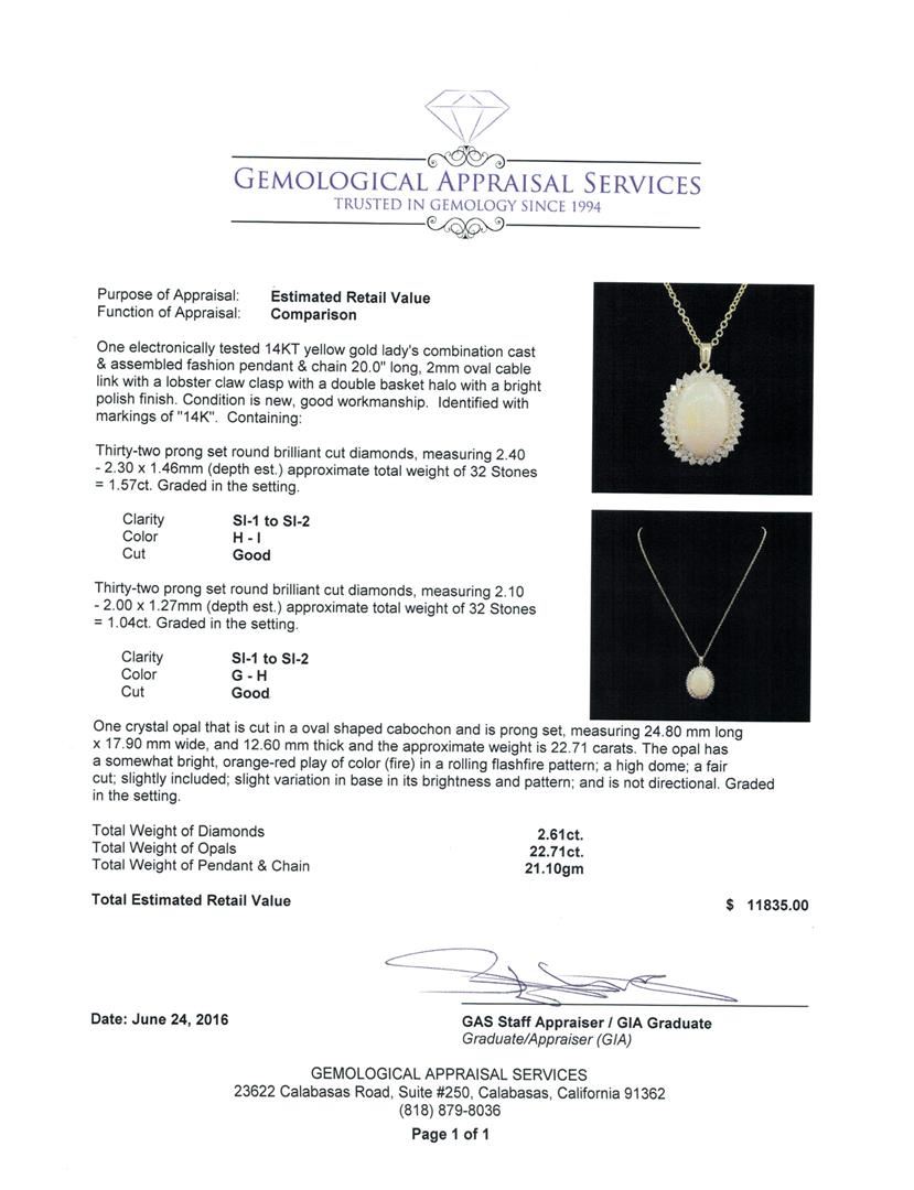 One electronically tested 14KT yellow gold lady's combination cast & assembled fashion pendant & chain 20.0" long, 2mm oval cable link with a lobster claw clasp with a double basket halo with a bright polish finish. Identified with markings of "14K". Condition is new, good workmanship. Containing: Thirty-Two prong set round brilliant cut diamonds, measuring 2.40 - 2.30 x 1.46mm (depth est.) approximate total weight of 32 Stones = 1.57ct. Graded in the setting. Clarity: SI-1 to SI-2. Color: H - I. Cut Good Thirty-Two prong set round brilliant cut diamonds, measuring 2.10 - 2.00 x 1.27mm (depth est.) approximate total weight of 32 Stones = 1.04ct. Graded in the setting. Clarity: SI-1 to SI-2. Color: G - Good One crystal opal that is cut in a oval shaped cabochon and is prong set, measuring 24.80 mm long x 17.90 mm wide, and 12.60 mm thick and the approximate weight is 22.71 carats. The opal has a somewhat bright, orange-red play of color (fire) in a rolling flashfire pattern; a high dome; a fair cut; slightly included; slight variation in base in its brightness and pattern; and is not directional. Graded in the setting. Total Weight of Diamonds 2.61ct. Total Weight of Opals 22.71ct. Total Weight of Pendant & Chain 21.10gm. GAS Appraised at $11,835.00.