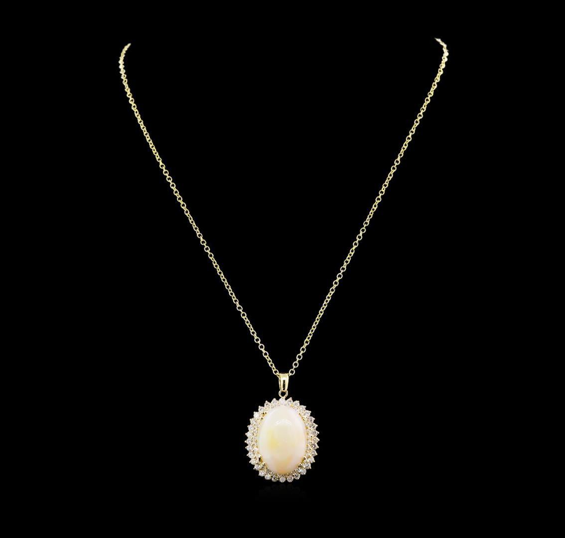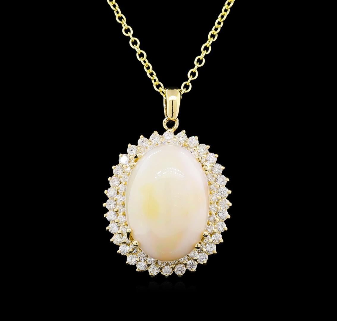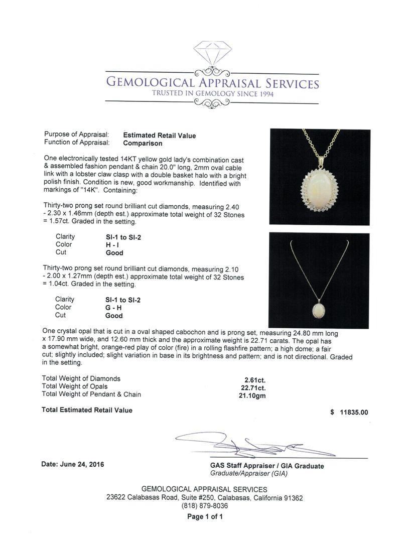 One electronically tested 14KT yellow gold lady's combination cast & assembled fashion pendant & chain 20.0" long, 2mm oval cable link with a lobster claw clasp with a double basket halo with a bright polish finish. Identified with markings of "14K". Condition is new, good workmanship. Containing: Thirty-Two prong set round brilliant cut diamonds, measuring 2.40 - 2.30 x 1.46mm (depth est.) approximate total weight of 32 Stones = 1.57ct. Graded in the setting. Clarity: SI-1 to SI-2. Color: H - I. Cut Good Thirty-Two prong set round brilliant cut diamonds, measuring 2.10 - 2.00 x 1.27mm (depth est.) approximate total weight of 32 Stones = 1.04ct. Graded in the setting. Clarity: SI-1 to SI-2. Color: G - Good One crystal opal that is cut in a oval shaped cabochon and is prong set, measuring 24.80 mm long x 17.90 mm wide, and 12.60 mm thick and the approximate weight is 22.71 carats. The opal has a somewhat bright, orange-red play of color (fire) in a rolling flashfire pattern; a high dome; a fair cut; slightly included; slight variation in base in its brightness and pattern; and is not directional. Graded in the setting. Total Weight of Diamonds 2.61ct. Total Weight of Opals 22.71ct. Total Weight of Pendant & Chain 21.10gm. GAS Appraised.