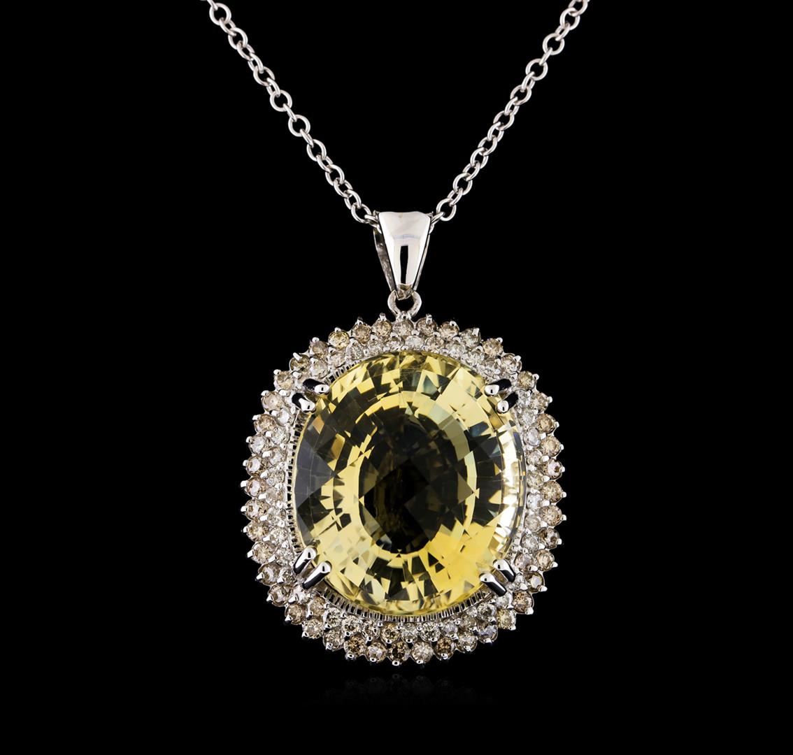 One electronically tested 14KT white gold ladies cast & assembled citrine and diamond pendant with chain. The pendant features a citrine set within a tiered diamond floret, completed by a white gold bail. The pendant is supported by a twenty inch length 14KT white gold cable chain, terminating in a lobster claw clasp. Bright and patterned finish. Identified with markings of "K14". Condition is new, good workmanship. Containing: One prong set oval mixed cut natural citrine quartz, measuring 27.00 x 23.50 x 6.40mm, approximate weight of 22.75ct., clarity is eye clean, type I, medium light, slightly brownish, orangy yellow color, (GIA oY 4/2), cut is good. Transmitting light with no distortion, transparent. Colored Stone Grading Report attached. Graded in the setting. Forty-Four prong set round brilliant cut diamonds, measuring 2.20 - 2.20 x 1.32mm (depth est.) approximate total weight of 44 Stones = 1.75ct. The group is composed of a mix of natural faint brown and very light brown diamonds. Clarity grade is an average for the group. Graded in the setting. Clarity: SI-2 to I-2 Forty-Four prong set round brilliant cut diamonds, measuring 2.00 - 2.00 x 1.20mm (depth est.) approximate total weight of 44 Stones = 1.33ct. Color & clarity grade are an average for the group. Graded in the setting. Clarity: SI-2 to I-2. Color: H - J. Total Weight of Colored Stones 22.75ct. Total Weight of Diamonds 3.08ct. Total Weight of Pendant With Chain 30.34gm. AIG Appraised at $11,405.00.