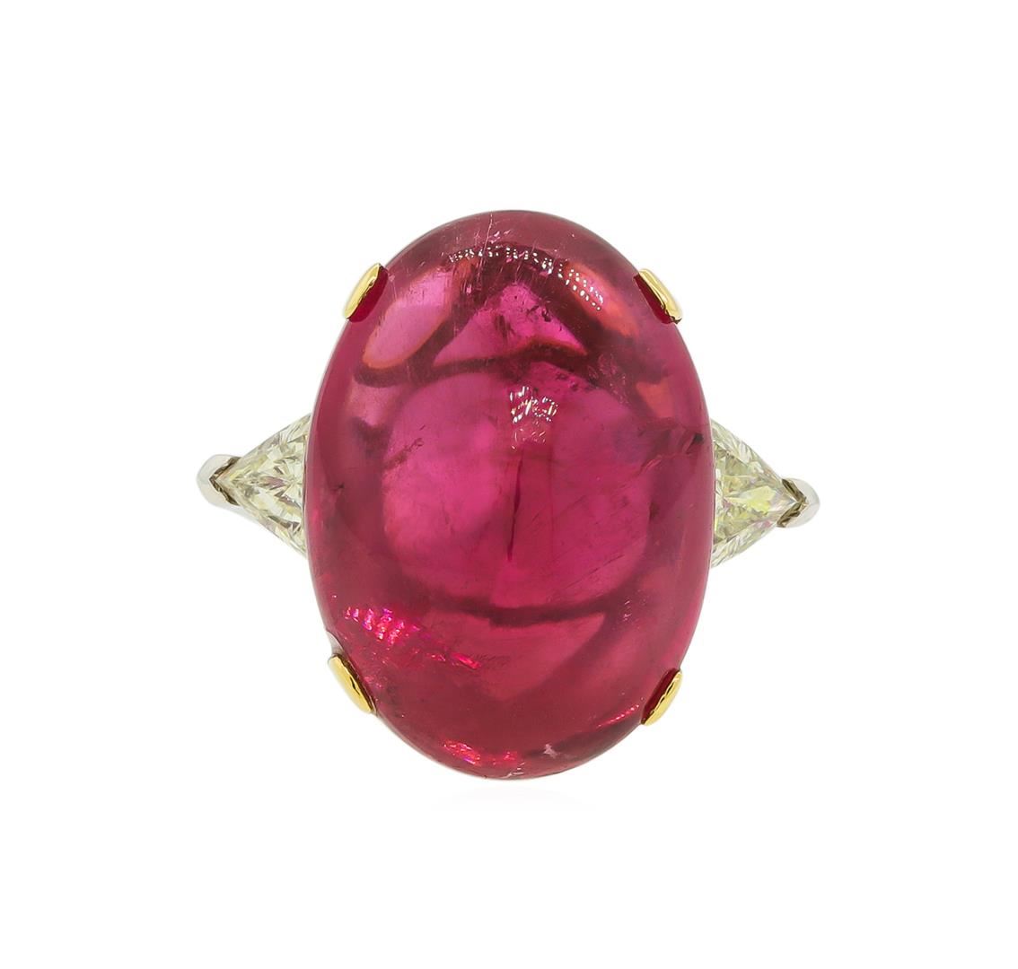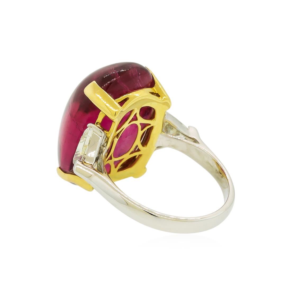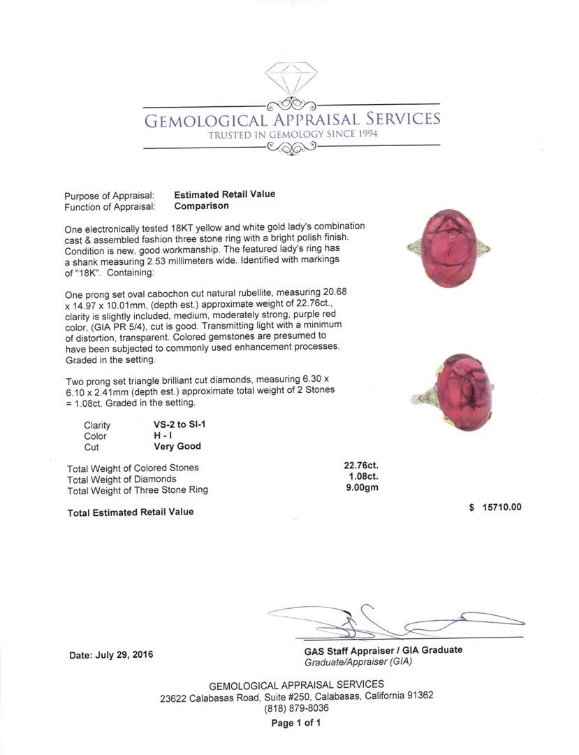 One electronically tested 18KT yellow and white gold lady's combination cast & assembled fashion three stone ring with a bright polish finish. The featured lady's ring has a shank measuring 2.53 millimeters wide. Identified with markings of '18K'. Condition is new, good workmanship. Containing: One prong set oval cabochon cut natural rubellite, measuring 20.68 x 14.97 x 10.01mm, (depth est.) approximate weight of 22.76ct., clarity is slightly included, medium, moderately strong, purple red color, (GIA PR 5/4), cut is good. Transmitting light with a minimum of distortion, transparent. Colored gemstones are presumed to have been subjected to commonly used enhancement processes. Graded in the setting. Two prong set triangle brilliant cut diamonds, measuring 6.30 x 6.10 x 2.41mm (depth est.) approximate total weight of 2 Stones = 1.08ct. Graded in the setting. Clarity VS-2 to SI-1. Color: H - I Cut Very Good. Total Weight of Colored Stones 22.76ct.. Total Weight of Diamonds 1.08ct.. Total Weight of Three Stone Ring 9.00gm. GAS Appraised at $15,710.00.