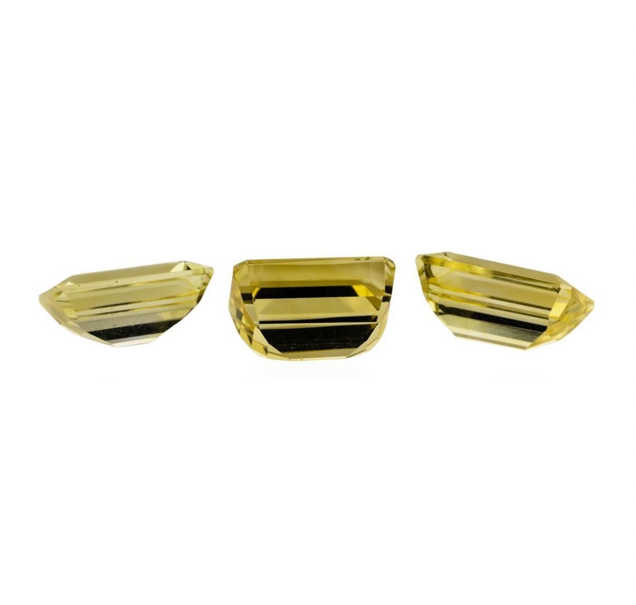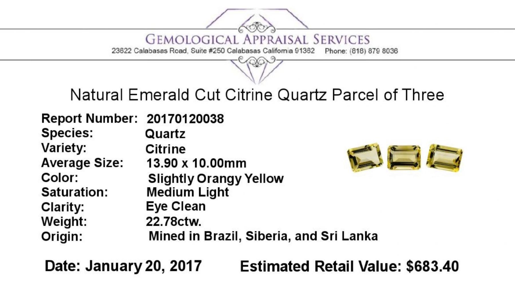 One natural emerald cut citrine quartz parcel of three with an exact weight of 22.78ctw., clarity is eye clean, slightly orangy yellow, medium light. Gemological Appraisals Services estimates the retail value at $683.4 GAS Appraised.