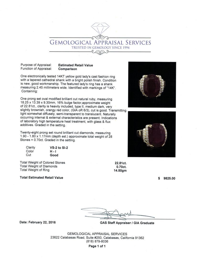 One electronically tested 14KT yellow gold lady's cast fashion ring with a tapered cathedral shank with a bright polish finish. The featured lady's ring has a shank measuring 2.45 millimeters wide. Identified with markings of "14K". Condition is new, good workmanship. Containing: One prong set oval modified brilliant cut natural ruby, measuring 18.25 x 13.39 x 9.30mm, 16%. bulge factor, approximate weight of 22.81ct., clarity is heavily included, type II, medium dark, very slightly brownish, orangy red color, (GIA oR 6/3), cut is good. Transmitting light somewhat diffusely, semi-transparent to translucent. Naturally occurring internal & external characteristics are present. Indications of laboratory high temperature heat treatment, with glass & flux additives. Graded in the setting. Twenty-Eight prong set round brilliant cut diamonds, measuring 1.90 - 1.80 x 1.17mm (depth est.) approximate total weight of 28 Stones = 0.70ct. Graded in the setting. Clarity: VS-2 to SI-2. Color: H - I. Cut Good. Total Weight of Colored Stones 22.81ct. Total Weight of Diamonds 0.70ct. Total Weight of Ring 14.50gm. GAS Appraised at $9,825.00.
