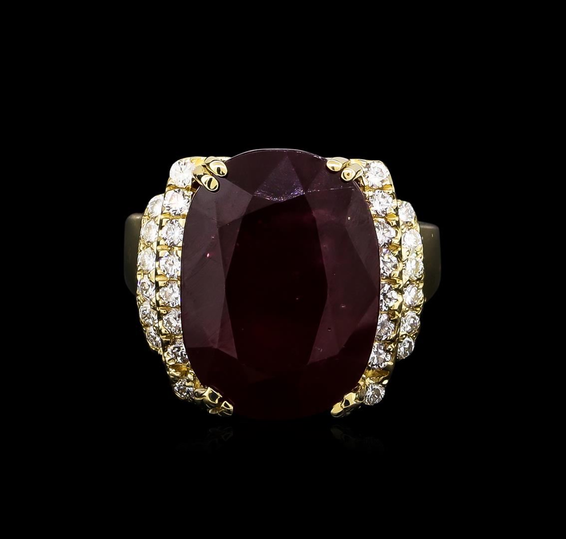 One electronically tested 14KT yellow gold lady's cast fashion ring with a tapered cathedral shank with a bright polish finish. The featured lady's ring has a shank measuring 2.45 millimeters wide. Identified with markings of "14K". Condition is new, good workmanship. Containing: One prong set oval modified brilliant cut natural ruby, measuring 18.25 x 13.39 x 9.30mm, 16%. bulge factor, approximate weight of 22.81ct., clarity is heavily included, type II, medium dark, very slightly brownish, orangy red color, (GIA oR 6/3), cut is good. Transmitting light somewhat diffusely, semi-transparent to translucent. Naturally occurring internal & external characteristics are present. Indications of laboratory high temperature heat treatment, with glass & flux additives. Graded in the setting. Twenty-Eight prong set round brilliant cut diamonds, measuring 1.90 - 1.80 x 1.17mm (depth est.) approximate total weight of 28 Stones = 0.70ct. Graded in the setting. Clarity: VS-2 to SI-2. Color: H - I. Cut Good. Total Weight of Colored Stones 22.81ct. Total Weight of Diamonds 0.70ct. Total Weight of Ring 14.50gm. GAS Appraised at $9,825.00.