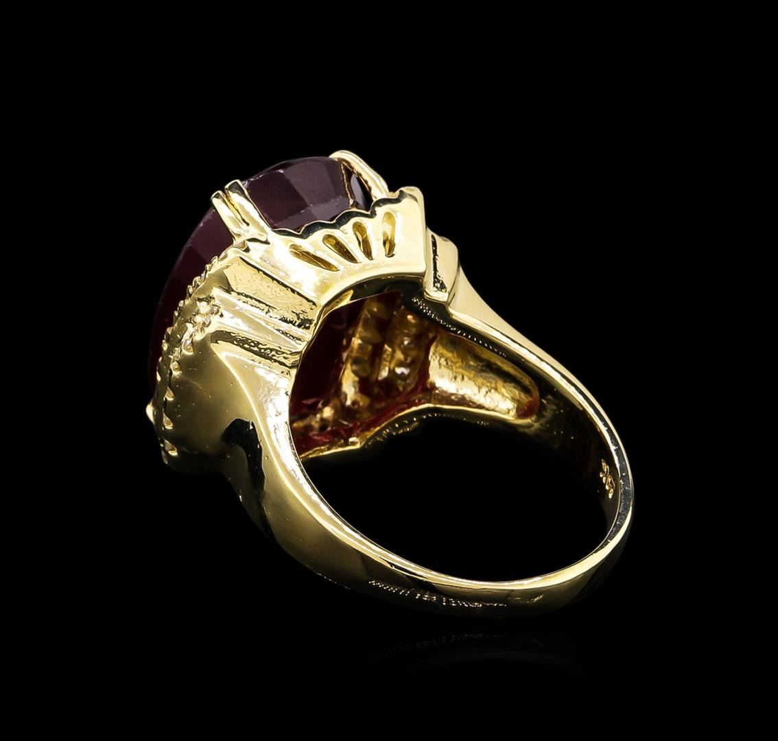 One electronically tested 14KT yellow gold lady's cast fashion ring with a tapered cathedral shank with a bright polish finish. The featured lady's ring has a shank measuring 2.45 millimeters wide. Identified with markings of "14K". Condition is new, good workmanship. Containing: One prong set oval modified brilliant cut natural ruby, measuring 18.25 x 13.39 x 9.30mm, 16%. bulge factor, approximate weight of 22.81ct., clarity is heavily included, type II, medium dark, very slightly brownish, orangy red color, (GIA oR 6/3), cut is good. Transmitting light somewhat diffusely, semi-transparent to translucent. Naturally occurring internal & external characteristics are present. Indications of laboratory high temperature heat treatment, with glass & flux additives. Graded in the setting. Twenty-Eight prong set round brilliant cut diamonds, measuring 1.90 - 1.80 x 1.17mm (depth est.) approximate total weight of 28 Stones = 0.70ct. Graded in the setting. Clarity: VS-2 to SI-2. Color: H - I. Cut Good. Total Weight of Colored Stones 22.81ct. Total Weight of Diamonds 0.70ct. Total Weight of Ring 14.50gm. GAS Appraised at $9,825.00.