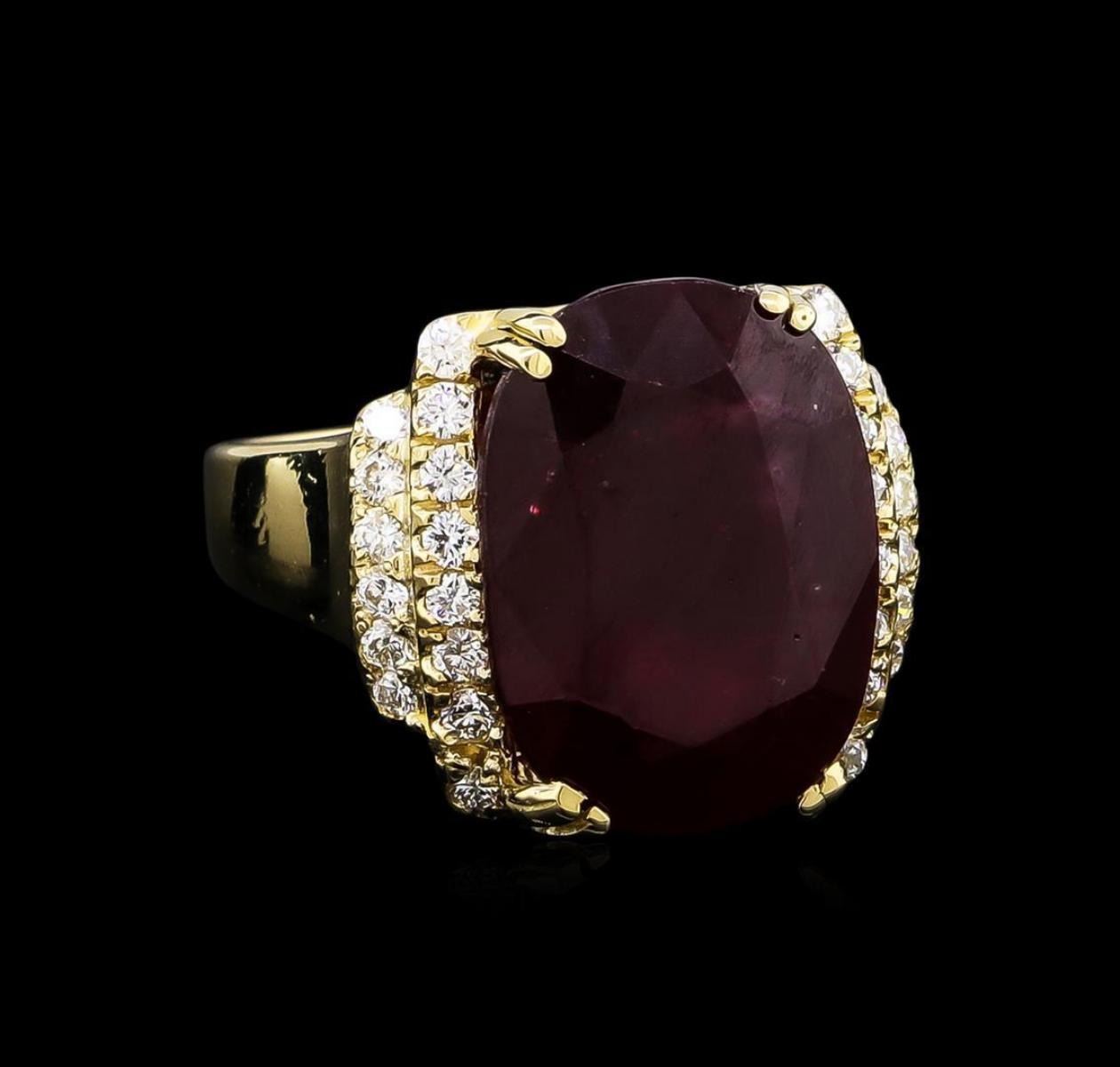 One electronically tested 14KT yellow gold lady's cast fashion ring with a tapered cathedral shank with a bright polish finish. The featured lady's ring has a shank measuring 2.45 millimeters wide. Identified with markings of "14K". Condition is new, good workmanship. Containing: One prong set oval modified brilliant cut natural ruby, measuring 18.25 x 13.39 x 9.30mm, 16%. bulge factor, approximate weight of 22.81ct., clarity is heavily included, type II, medium dark, very slightly brownish, orangy red color, (GIA oR 6/3), cut is good. Transmitting light somewhat diffusely, semi-transparent to translucent. Naturally occurring internal & external characteristics are present. Indications of laboratory high temperature heat treatment, with glass & flux additives. Graded in the setting. Twenty-Eight prong set round brilliant cut diamonds, measuring 1.90 - 1.80 x 1.17mm (depth est.) approximate total weight of 28 Stones = 0.70ct. Graded in the setting. Clarity: VS-2 to SI-2. Color: H - I. Cut Good. Total Weight of Colored Stones 22.81ct. Total Weight of Diamonds 0.70ct. Total Weight of Ring 14.50gm. GAS Appraised.