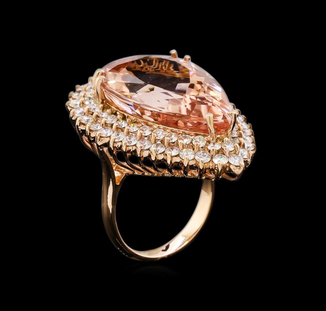One electronically tested 14KT rose gold lady's cast fashion ring with a double basket halo with a bright polish finish. The featured lady's ring has a shank measuring 3.20 millimeters wide. Identified with markings of "K14". Condition is new, good workmanship. Containing: One prong set pear modified brilliant cut natural morganite, measuring 26.40 x 16.14 x 9.95mm, approximate weight of 22.88ct., clarity is eye clean, type I, light, very slightly brownish, orangy red color, (GIA oR 3/3), cut is very good. Transmitting light with no distortion, transparent. Colored gemstones are presumed to have been subjected to commonly used enhancement processes. Graded in the setting. Thirty-Four prong set round brilliant cut diamonds, measuring 2.40 - 2.30 x 1.43mm (depth est.) approximate total weight of 34 Stones = 1.65ct. Graded in the setting. Clarity: VS-2 to SI-2. Color: H - I. Cut Good Thirty-Three prong set round brilliant cut diamonds, measuring 2.10 - 2.00 x 1.29mm (depth est.) approximate total weight of 33 Stones = 1.10ct. Graded in the setting. Clarity: VS-2 to SI-2. Color: H - I. Cut Good. Total Weight of Colored Stones 22.88ct. Total Weight of Diamonds 2.75ct. Total Weight of Ring 15.20gm. GAS Appraised at $20,225.00.