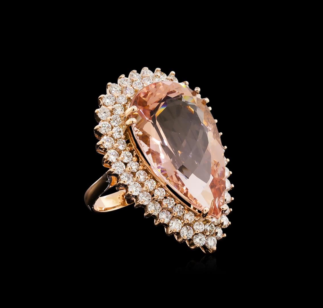 One electronically tested 14KT rose gold lady's cast fashion ring with a double basket halo with a bright polish finish. The featured lady's ring has a shank measuring 3.20 millimeters wide. Identified with markings of "K14". Condition is new, good workmanship. Containing: One prong set pear modified brilliant cut natural morganite, measuring 26.40 x 16.14 x 9.95mm, approximate weight of 22.88ct., clarity is eye clean, type I, light, very slightly brownish, orangy red color, (GIA oR 3/3), cut is very good. Transmitting light with no distortion, transparent. Colored gemstones are presumed to have been subjected to commonly used enhancement processes. Graded in the setting. Thirty-Four prong set round brilliant cut diamonds, measuring 2.40 - 2.30 x 1.43mm (depth est.) approximate total weight of 34 Stones = 1.65ct. Graded in the setting. Clarity: VS-2 to SI-2. Color: H - I. Cut Good Thirty-Three prong set round brilliant cut diamonds, measuring 2.10 - 2.00 x 1.29mm (depth est.) approximate total weight of 33 Stones = 1.10ct. Graded in the setting. Clarity: VS-2 to SI-2. Color: H - I. Cut Good. Total Weight of Colored Stones 22.88ct. Total Weight of Diamonds 2.75ct. Total Weight of Ring 15.20gm. GAS Appraised at $20,225.00.