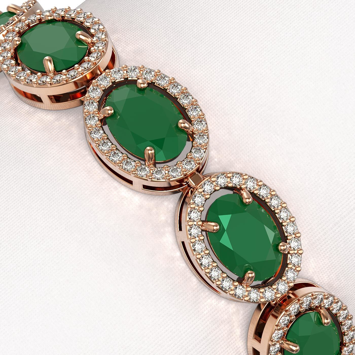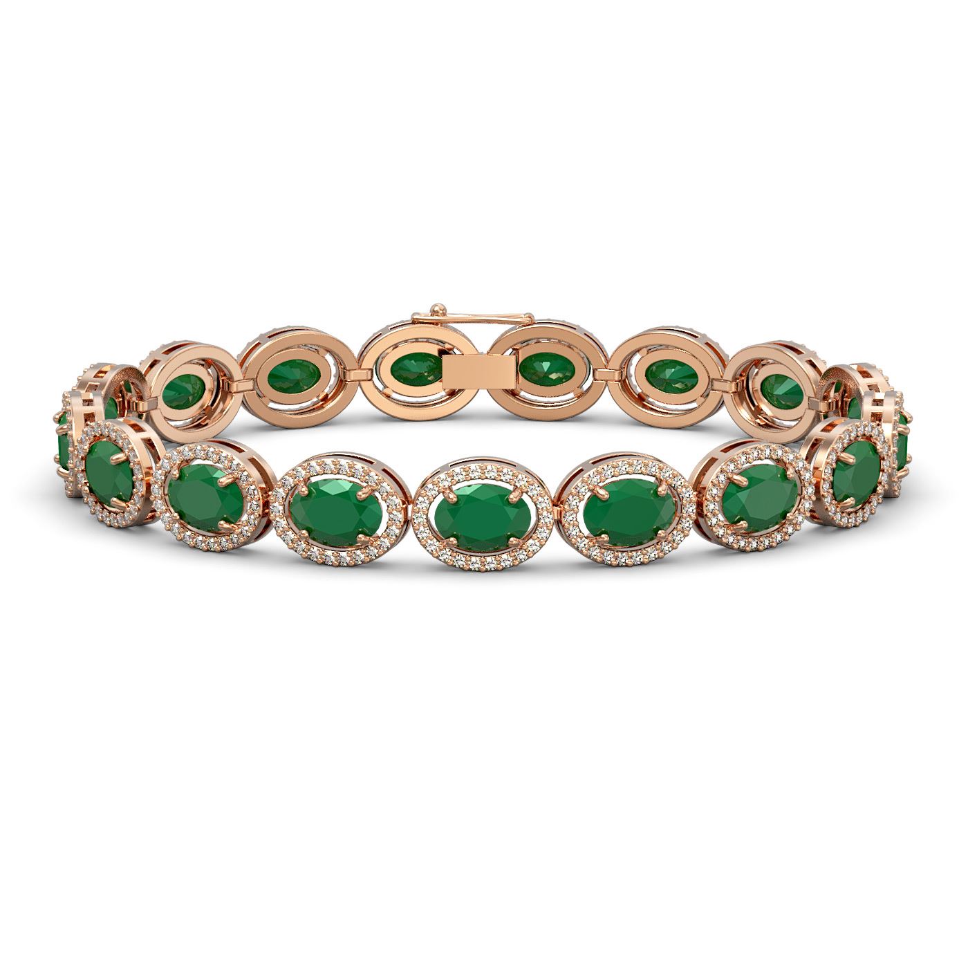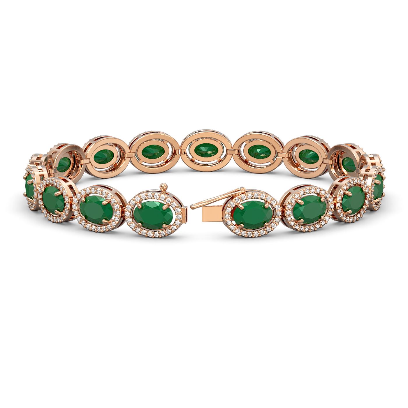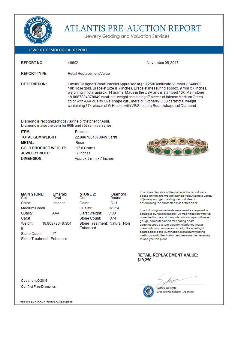40602 - REF-291N5A ---- 22.89 CTW Emerald & Diamond Bracelet Rose Gold 10K Rose Gold ---- Luxury Designer Brand Bracelet Appraised at $19,250 Certificate Number US40602  10k Rose gold,  Bracelet Size is 7 Inches, Bracelet measuring approx. 9 mm x 7 Inches, weighing in total approx. 14 grams. Made in the USA and is stamped 10k, Main stone 19.8087804878049 carat total weight containing 17 pieces of Intense Medium Green color with AAA quality Oval shape cut Emerald , Stone #2 3.08 carat total weight containing 374 pieces of G-H color with  VS/SI quality Round shape cut Diamond