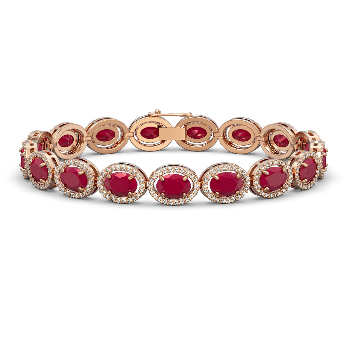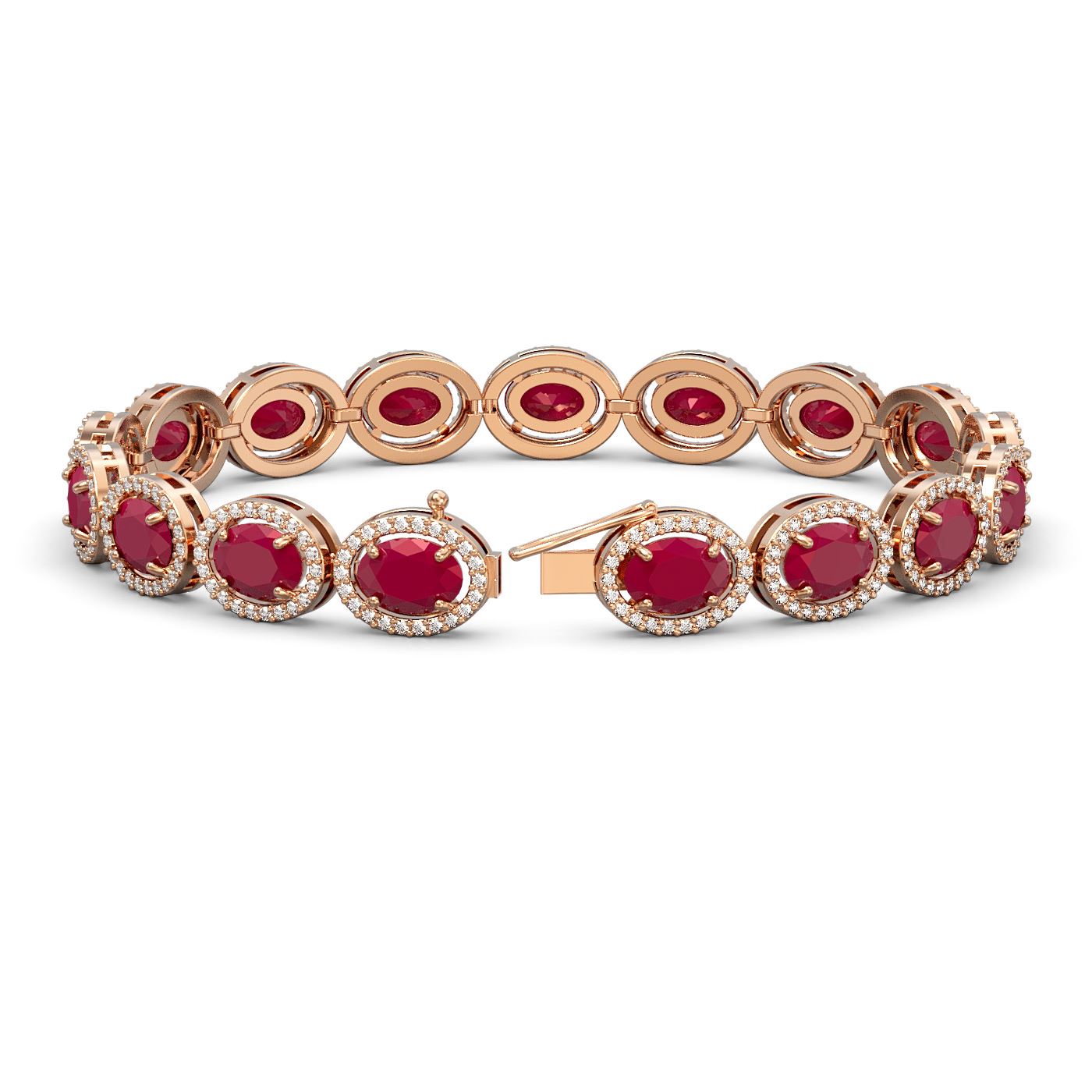 REF-291M5H -40605 ---- 22.89 CTW Ruby & Diamond Halo Bracelet 10K Rose Gold ---- Luxury Designer Brand Bracelet Appraised at $16,050 Certificate Number US40605 10k Rose gold, Bracelet Size is 7 Inches, Bracelet measuring approx. 9 mm x 7 Inches, weighing in total approx. 14 grams. Made in the USA and is stamped 10k, Main stone 19.8087804878049 carat total weight containing 17 pieces of Mid-Opaque-Deep Red color with AAA quality Oval shape cut Ruby , Stone #2 3.08 carat total weight containing 374 pieces of G-H color with VS/SI quality Round shape cut Diamond