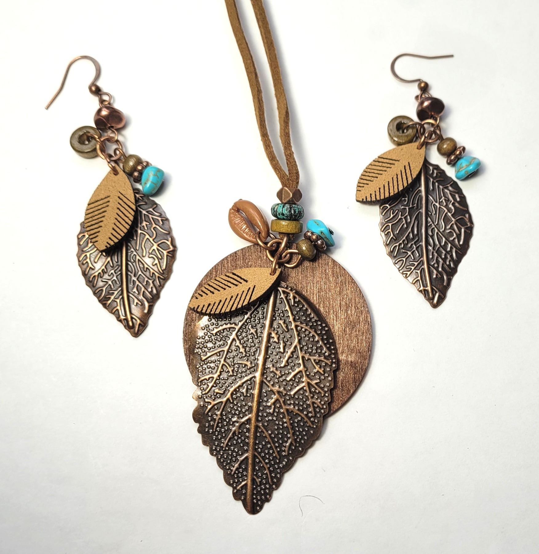 & WOODEN WITH TURQUOISE ACCENTS, LEAF EARRINGS AND PENDANT ON SUEDE CORD. JEWELERY