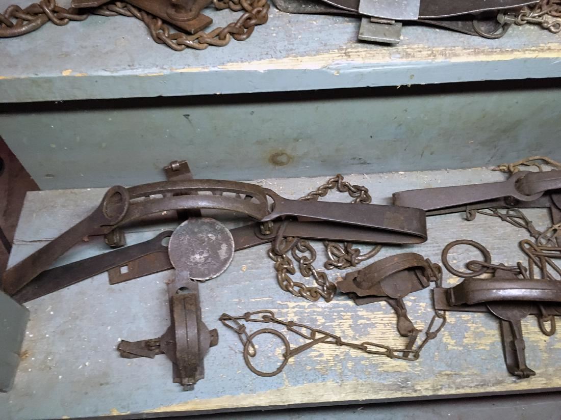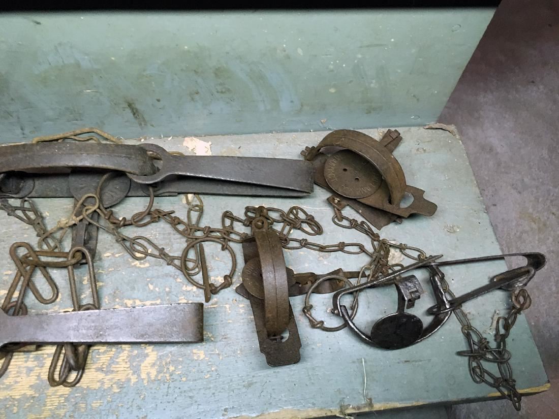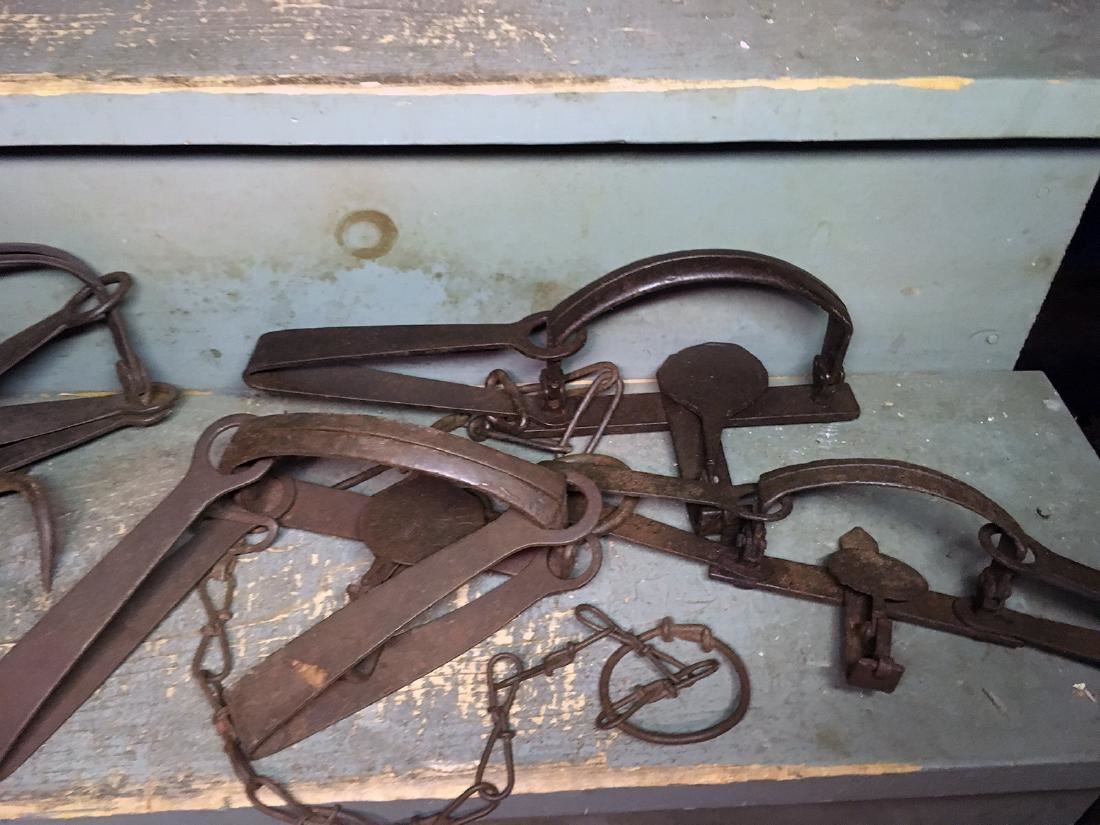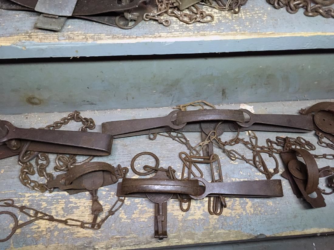 Approx. 22 antique steel traps, medum and small sizes including Newhouse and Victor traps. Well cared for and oiled, part of a lifetime collection (RL).