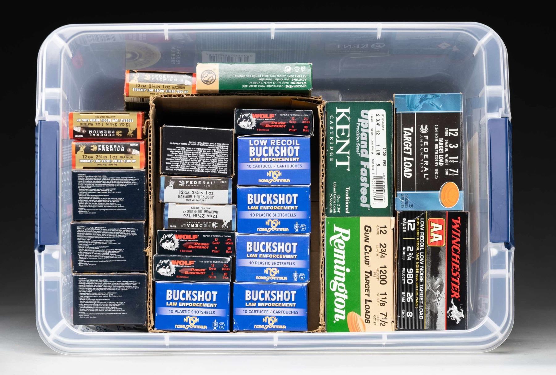 LOT CONTAINS HOLLOW POINT AMMO. 3 BOXES (30 rds.) Fiocchi - Exacta Aro-Slug - 7/8 oz. 3 BOXES (14 rds.) Federal - Truball low recoil rifled slug HP - 1oz. 1 BOX (8 rds.) Sellier & Bellot - 00 Buck. 1 BOX (10 rds.) Winchester PDX1 Defender - 1 oz - Rifled slug & 3 plated 00 buck pellets. 2 BOXES (8 rds.) Federal - 1 oz. - Maximum rifled slug HP. 3 BOXES (15 rds.) Wolf - 00 Buck. 5 BOXES (50 rds.) NobelSport Law Enforcement - 4 buck. 1 BOX (25 rds.) Kent - #6 - 1 1/8oz. 1 BOX (25 rds.) Federal - Target Load - #7 1/2 - 1 1/8oz. 1 BOX (25 rds.) Remington - Gun Club Target Loads - #7 1/2 - 1 1/8 oz. 1 BOX (18 rds.) of mixed #8. CONDITION: ammo appears serviceable with boxes in very good condition. (02-25070/MD). AMMO. $100-150.