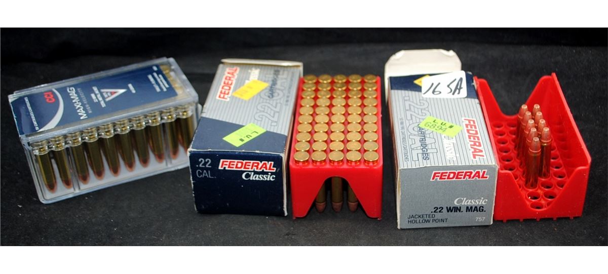 1 BOX MAXI-MAG .22 CAL 40 GRAIN CARTRIDES, 1 BOX OF 50 FEDERAL CLASSIC .22 CAL WIN. MAG HOLLOW POINT CARTRIDGES , 9 .22 CAL FEDERAL CLASSIC CARTRIDGES