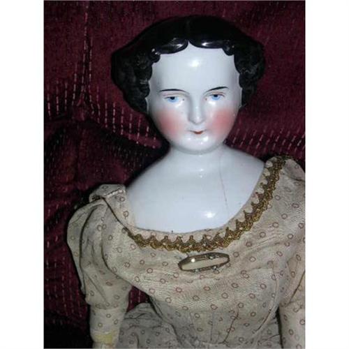 22" China all Original 1860's (As Is). Too bad the older looking lady's head has damage. Thre is a piece out of the front base and the crack goes up and over the shoulder plate at the neck into the back of the shoulder plate at the base. She has vertical curls all across the bad. The number 10 is on the back of the shoulder plate. She has a great dress and two slips, no pantaloons.Arms and hands have had some repair and need additional. The pin on her dress is old. She is sold as is. Doll comes from a smoke free environment. Buyer to pay shipping, handling, and insurance. Thanks for viewing.