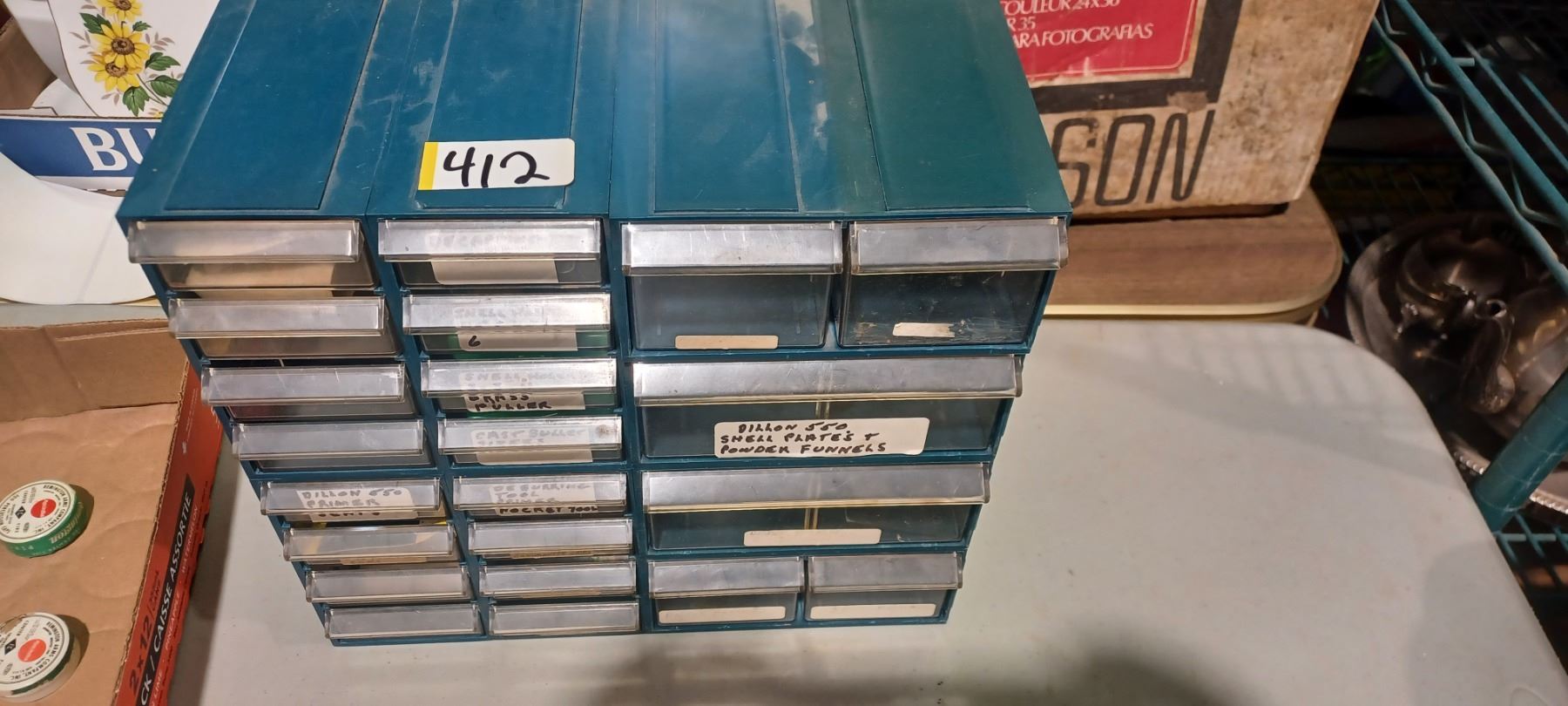 22 DRAWER STORAGE BIN C/W LARGE SELECTION OF SHELL HOLDERS AND RELOADING ACCESSORIES
