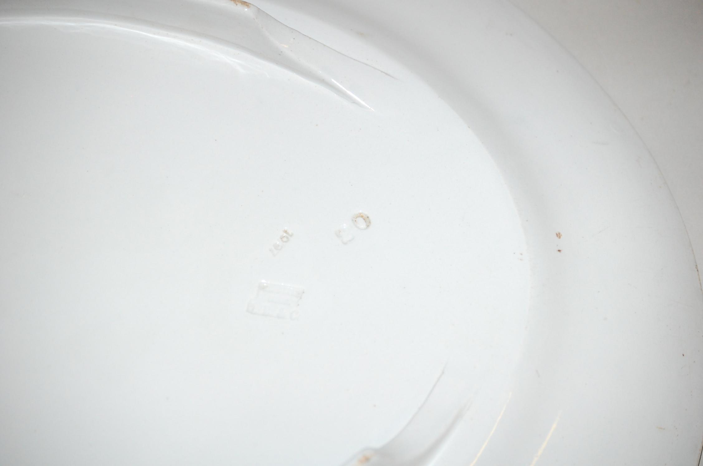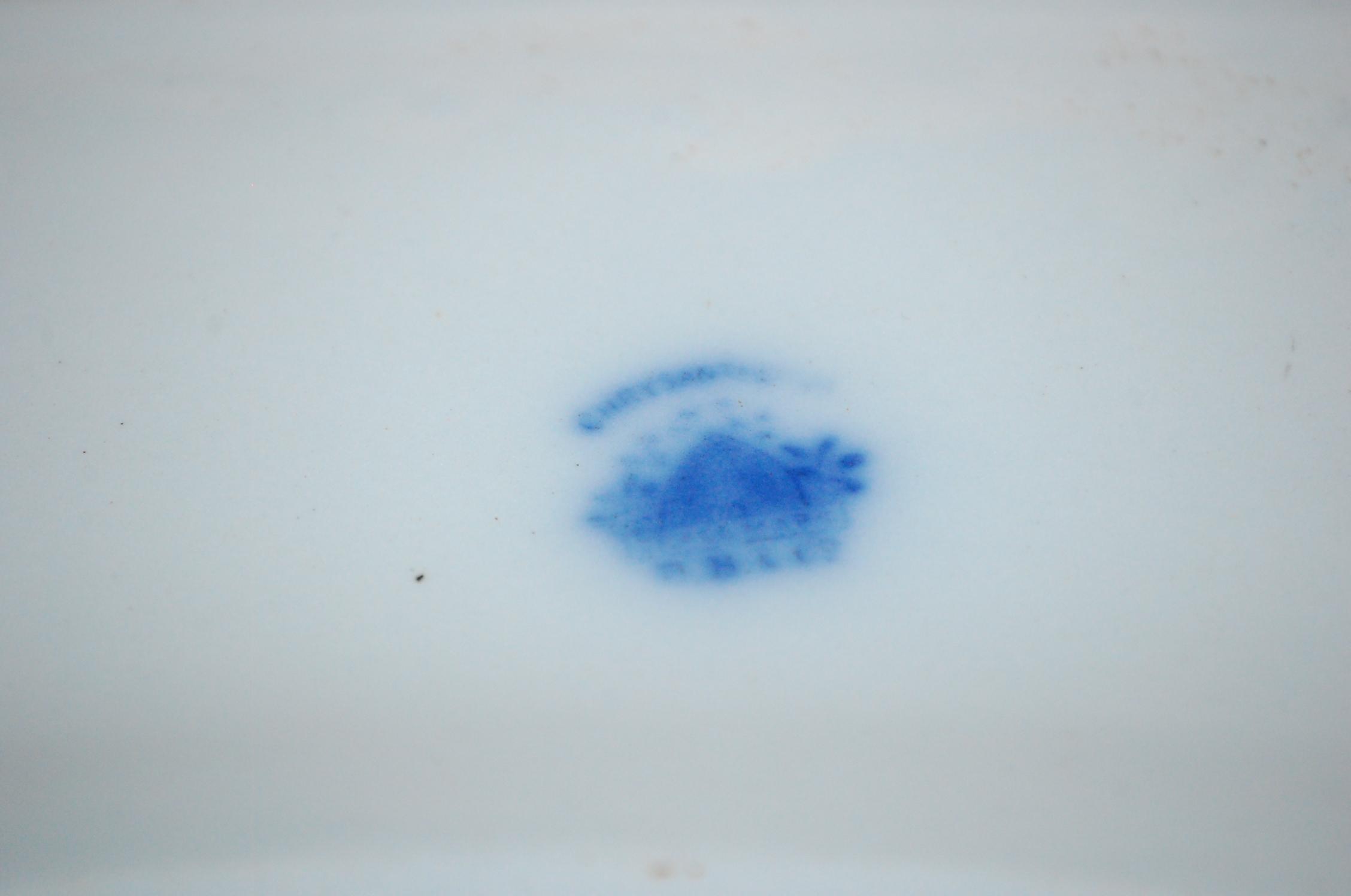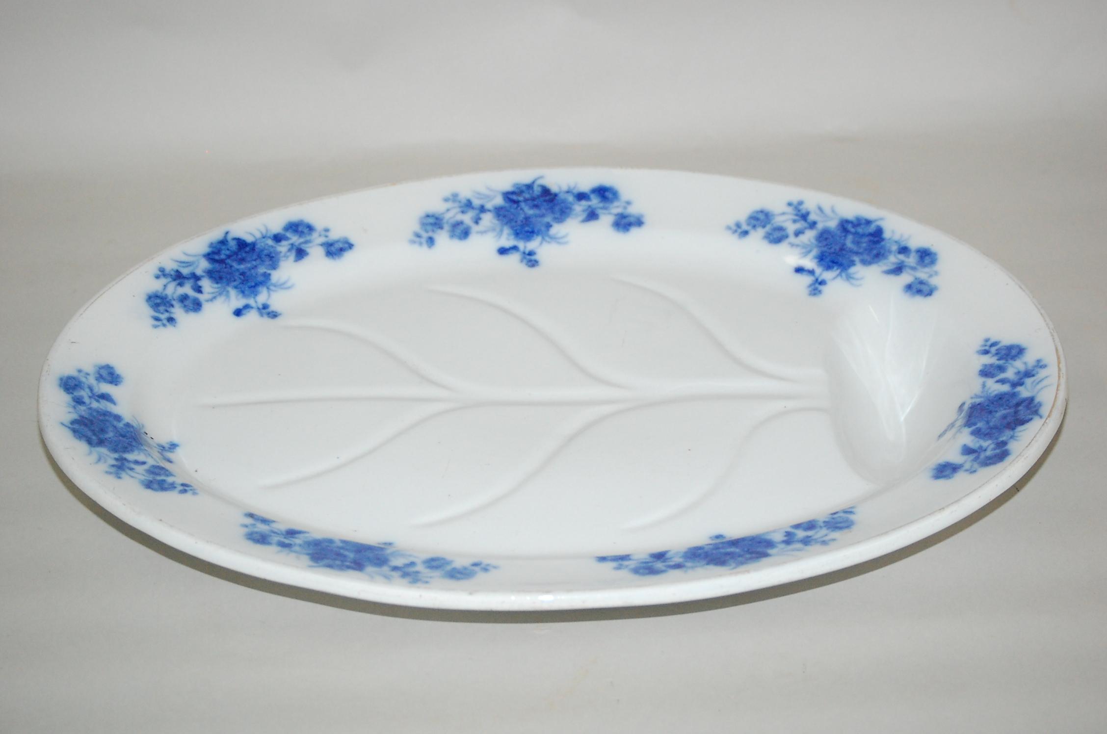 22" FLOW BLUE WELL & TREE PLATTER - 19TH CENT. FLOW BLUE IRONSTONE WELL & TREE PLATTER W/ SAUCE BOWL W/FLORAL DECORATION-IMPRESSED MARKS ON BACK (22" L X 16 3/4" W) - WEAR, SCRATCHES, IMPERFECTIONS