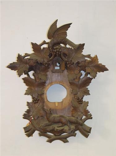 22" GERMAN BLACK FOREST CARVED CUCKOO CLOCK CASE W/ BIRD, GRAPES & FOX - NO WORKS OR FACE, LOSSES & IMPERFECTIONS