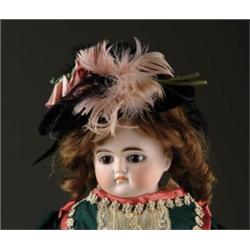 22” GERMAN CLOSE MOUTH TURNED SHOULDER HEAD DOLL. Unmarked but attributed to Kestner. With brown glass stationary eyes, on gusseted leather body with bisque lower arms dressed in a two-piece dark green taffeta costume trimmed in mauve silk and ivory lace. Antique undergarments and newer black oilcloth shoes complete with buckles. Wearing an antique brown human hair wig over original plaster pate topped with a black velvet hat decorated with silk roses and black feathers. CONDITION: Overall condition very good, however a black kiln dust spot between the eyes and an inherent roughness to the inside of one finger. RS 1-3565 (800-1,200)