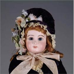 22” INCISED DEPOSE JUMEAU 10 BEBE. Blue paperweight eyes, pale bisque and a straight-wristed marked Jumeau body (some wear and repainting) are featured on this Bebe. She has auburn human hair with pin curls and a newer French Bebe style dress with matching bonnet and wearing antique leather shoes. CONDITION: Restoration to rear of bisque head. Restoration does not interfere with any facial features whatsoever. JL1-2858