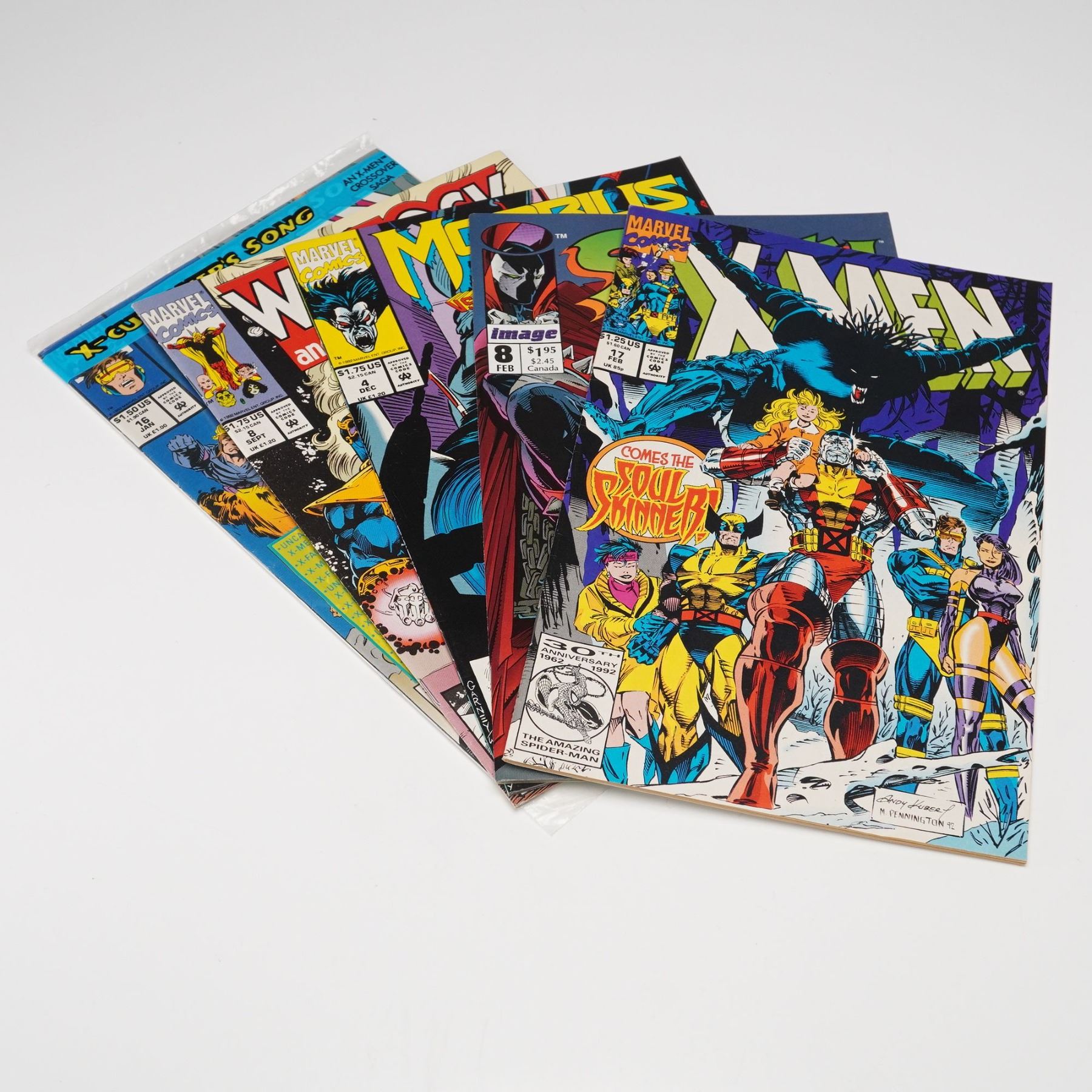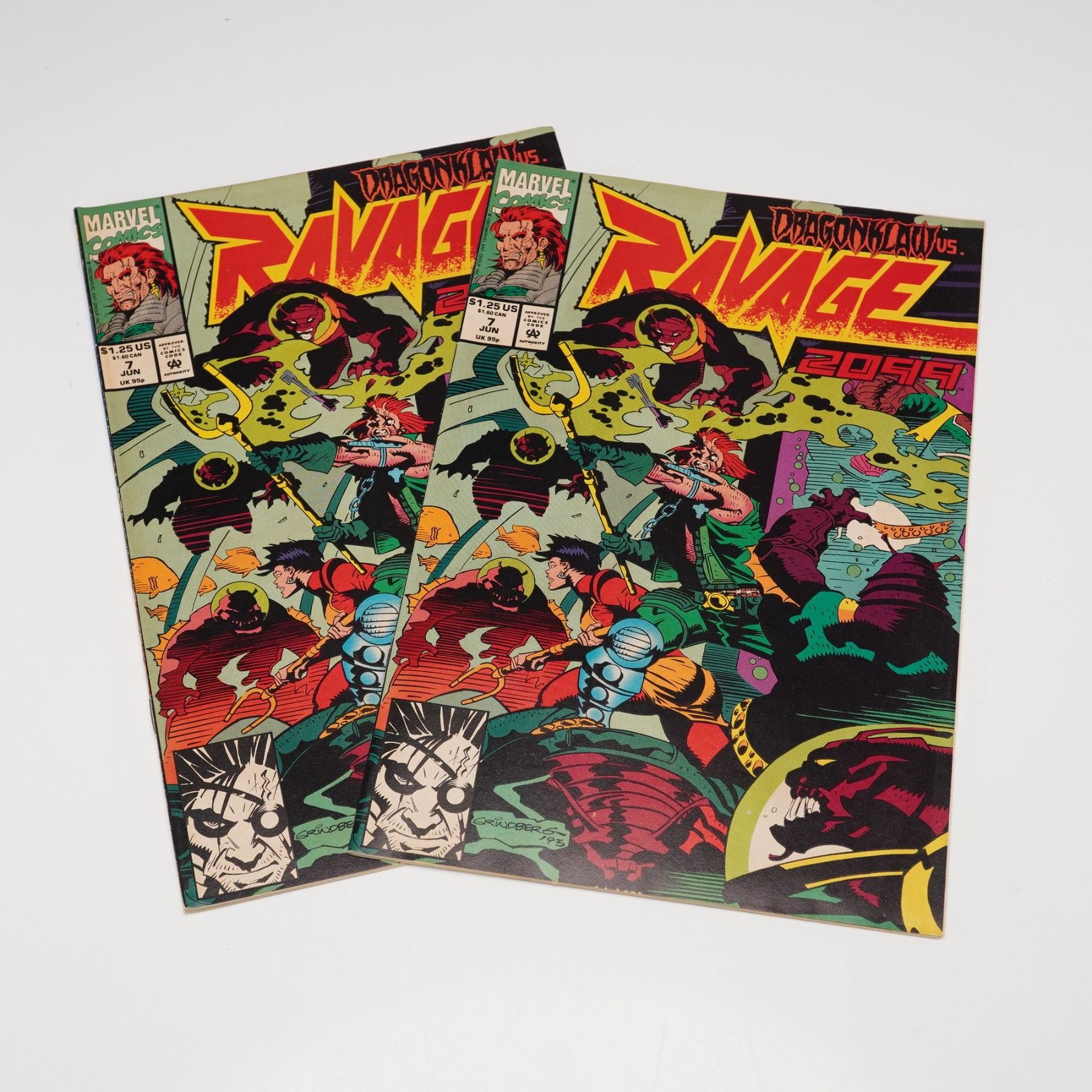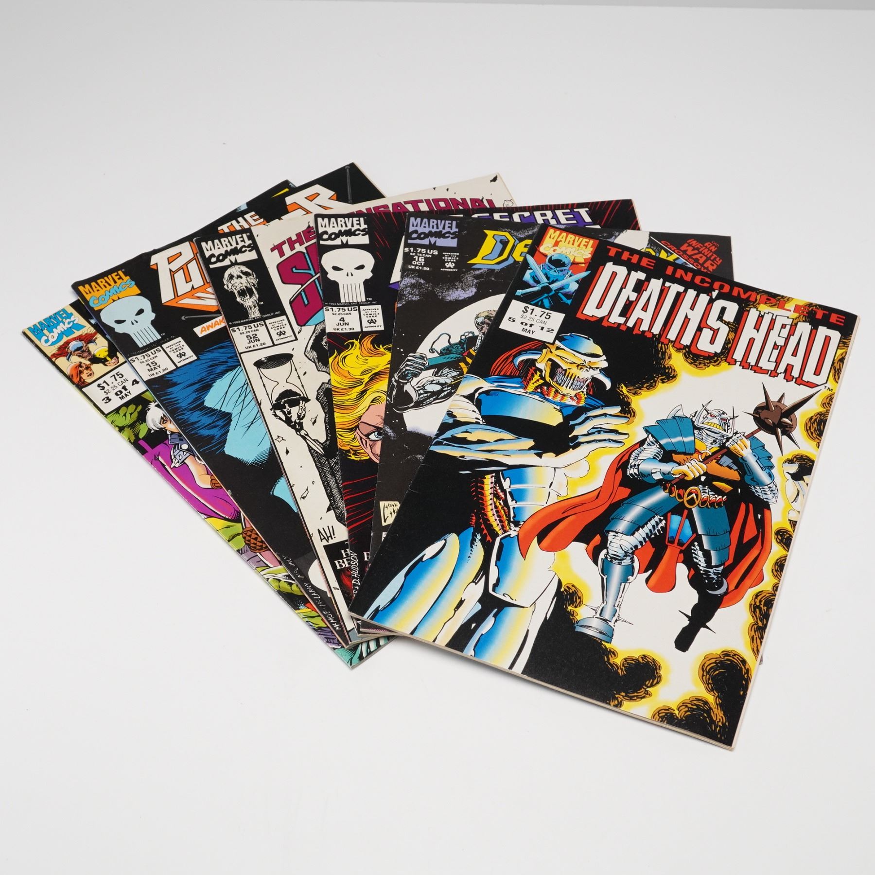 Showcasing a vivid range of superhero adventures and crossovers from the early 1990s. Included are titles such as *The Amazing Spider-Man*, featuring the "Invasion of the Spider Slayers" storyline; *Guardians of the Galaxy* with the "Doppelganger" saga; and *X-Men* spotlighting Magneto and the Soul Skinner arc. Other notable inclusions are "The Incomplete Death's Head", "Knights of Pendragon", "Ravage 2099", and "What The--?!", offering a mix of mainstream heroes and experimental titles from Marvel's creative boom period. This set highlights the diverse storytelling and bold artwork that defined Marvel's early modern age. This set of issues is graded at (VG) or Very Good.