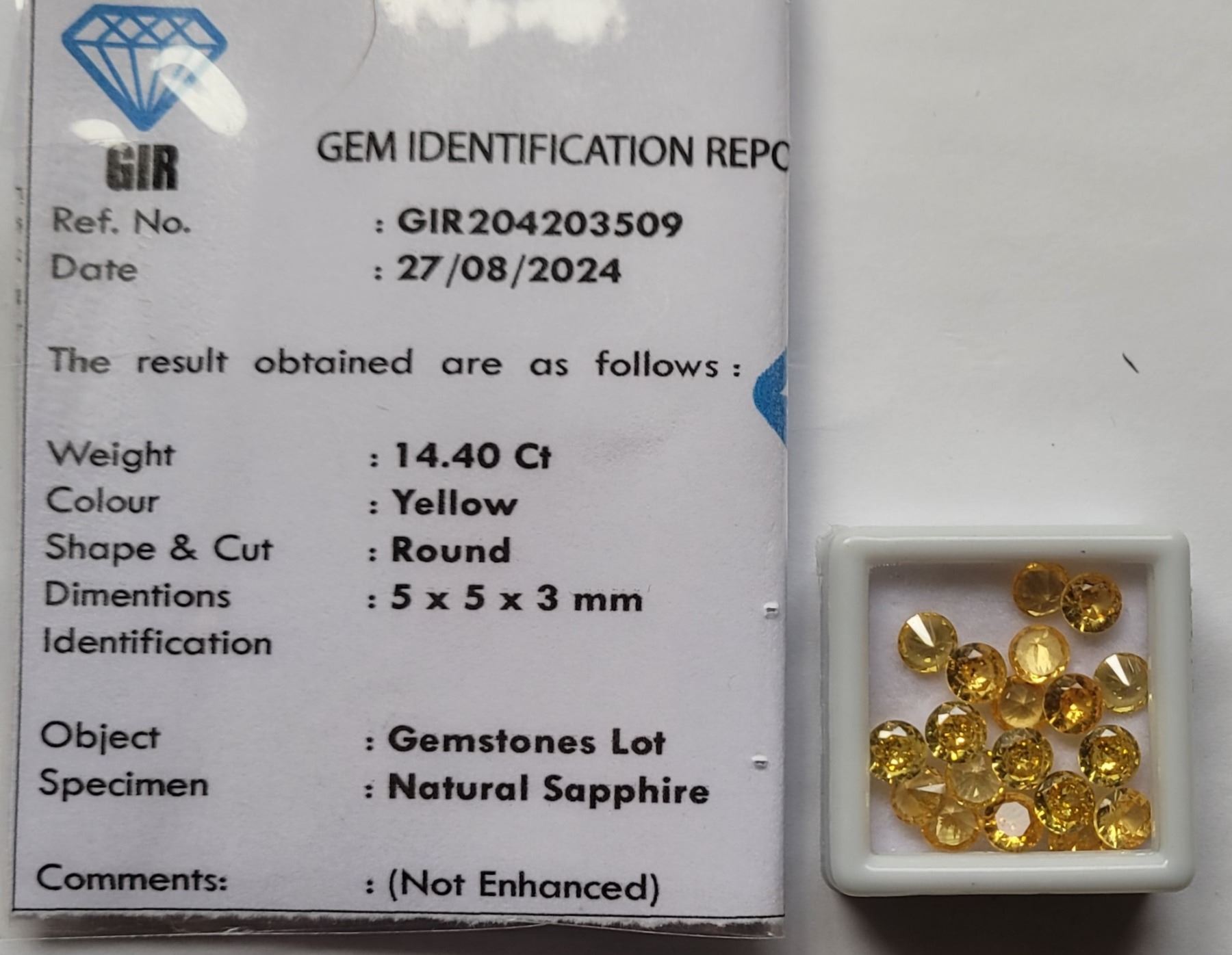 YELLOW SAPPHIRE GEMSTONES, AND GEMOLOGIST REPORT, TOTAL OF 14.4 CTS, READY FOR SETTING. JEWELERY
