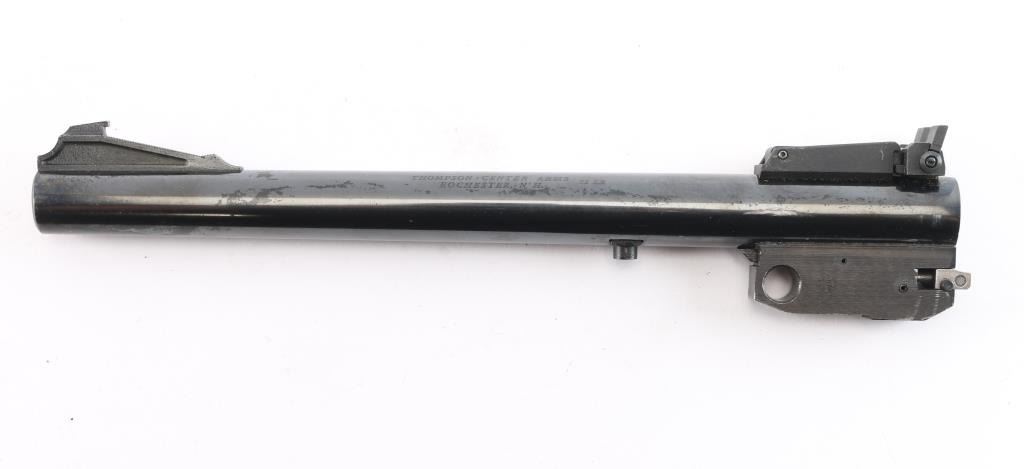 Thompson Contender barrel chambered in .22 Long Rifle. This is a 10" blued barrel with a serrated ramped front sight, and a fully adjustable square notch rear sight. The bore is dirty but appears bright with strong rifling. The blued finish is very good with approximately 98% remaining showing extremely light muzzle edge wear, superficial scratches, and some losses where the action rubs.