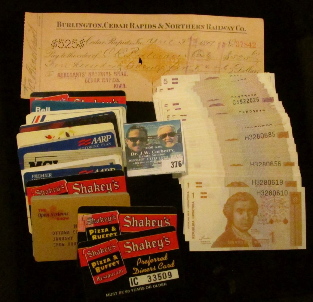 (22) Old Credit Card Style cards including "Shakey's Pizza & Buffet", (many were issued to Dr. Carberry, but most likely were never activated); Check with Gold Revenue Stamp "Burlington, Cedar Rapids & Northern Railway Co. Cedar Rapids, Iowa"; & group of (72 pcs.) One Dinar Republic of Hrvatska Banknotes in crisp Uncirculated condition, many of which are in sequential serial numbers.
