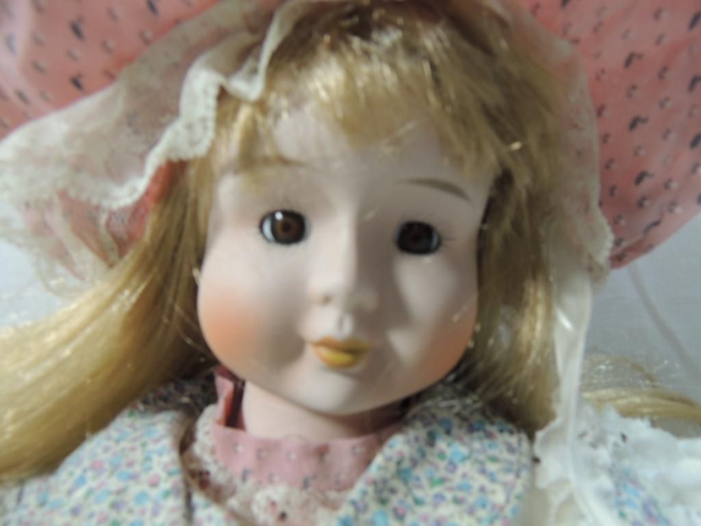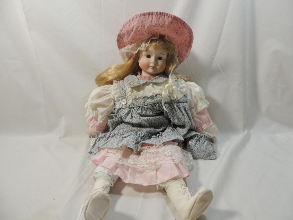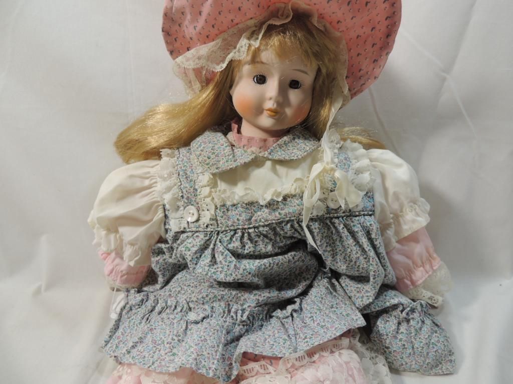 PORCELAIN DOLL WITH COUNTRY FLORAL DRESS AND MATCHING HAT. AS SHOWN SEE PHOTO FOR MORE DETAILS.