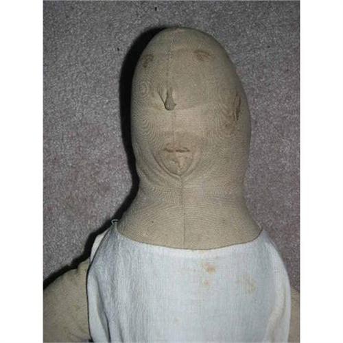 22" Primitive Rag Doll with Ink Features. the name Ruby is in the back. Maybe this was the little owner's name or the doll's name. There are several places where the seams have added stitches. She is cotton stuffed. There is one hole in the bottom of the doll. She can sit without a stand. She's a very unusual old doll.