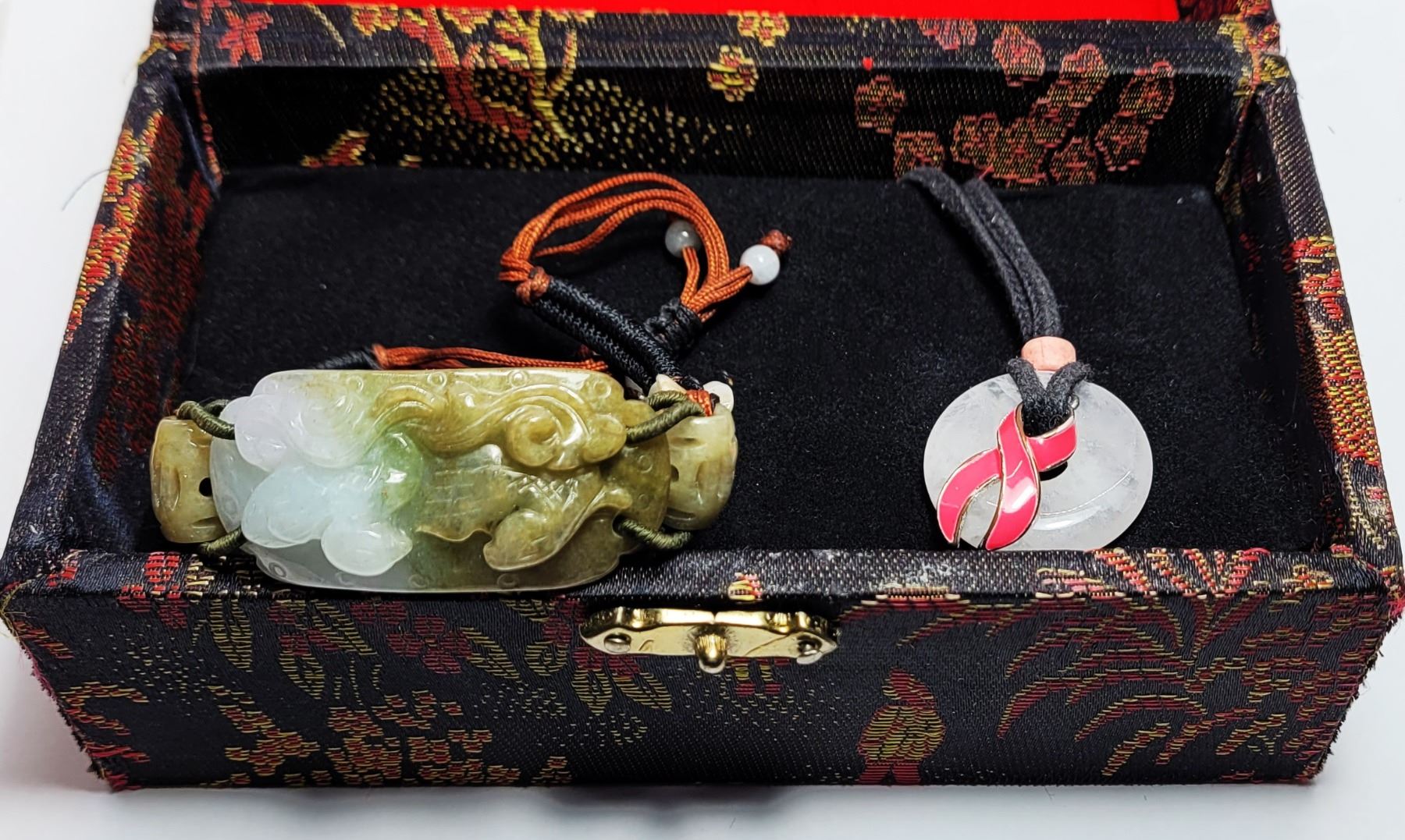 CANCER AWARENESS CHARM & GREEN & WHITE JADEITE ADJUSTABLE BRACELET, BOTH SET ON SILK CORDS IN AN ASIAN INSPIRED GIFT BOX. JEWELLERY