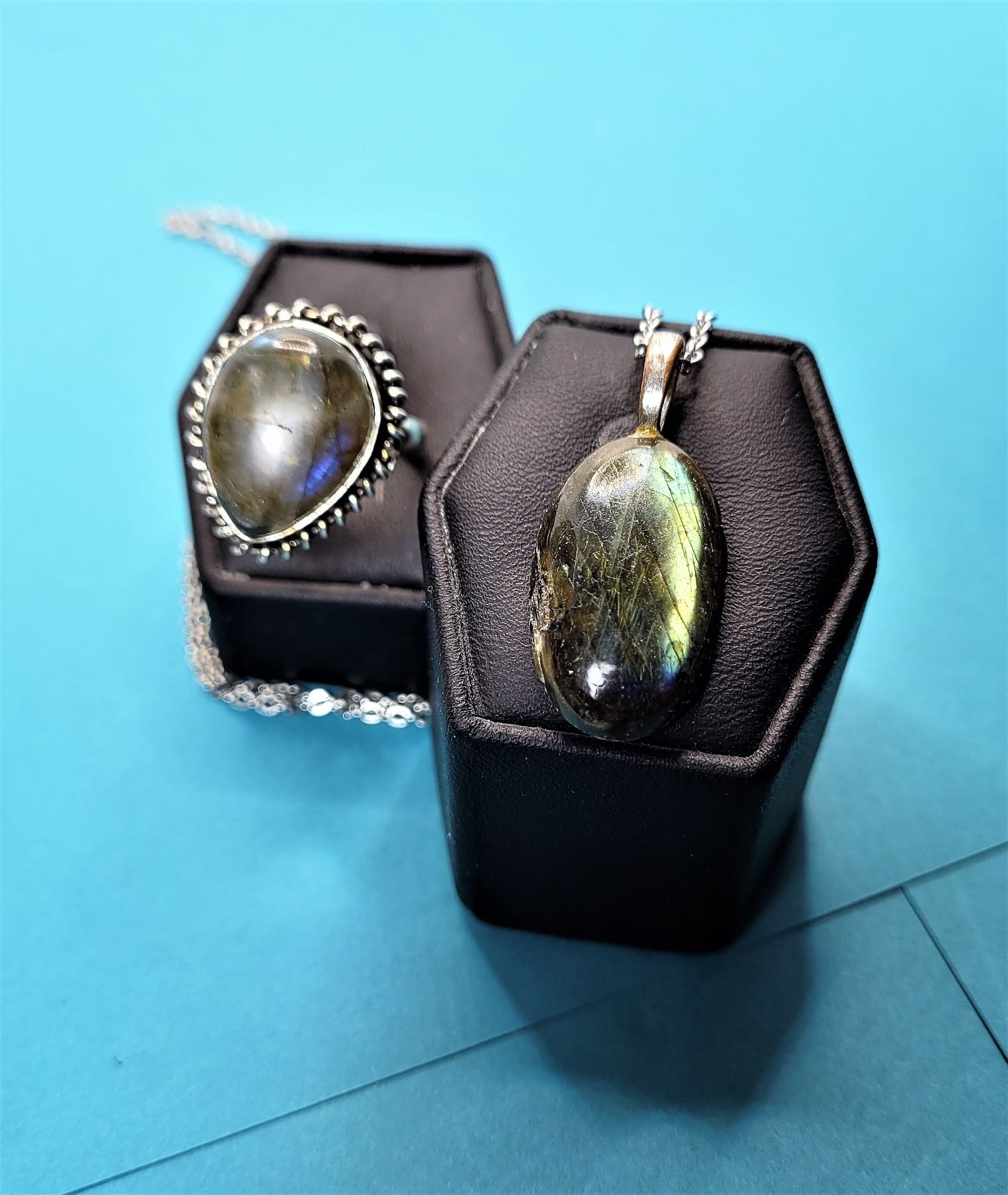 PENDANT, RING IS SIZE 9 AND PENDANT IS ON 17" STAINLESS STEEL (HYPOALLERGENIC) CHAIN.