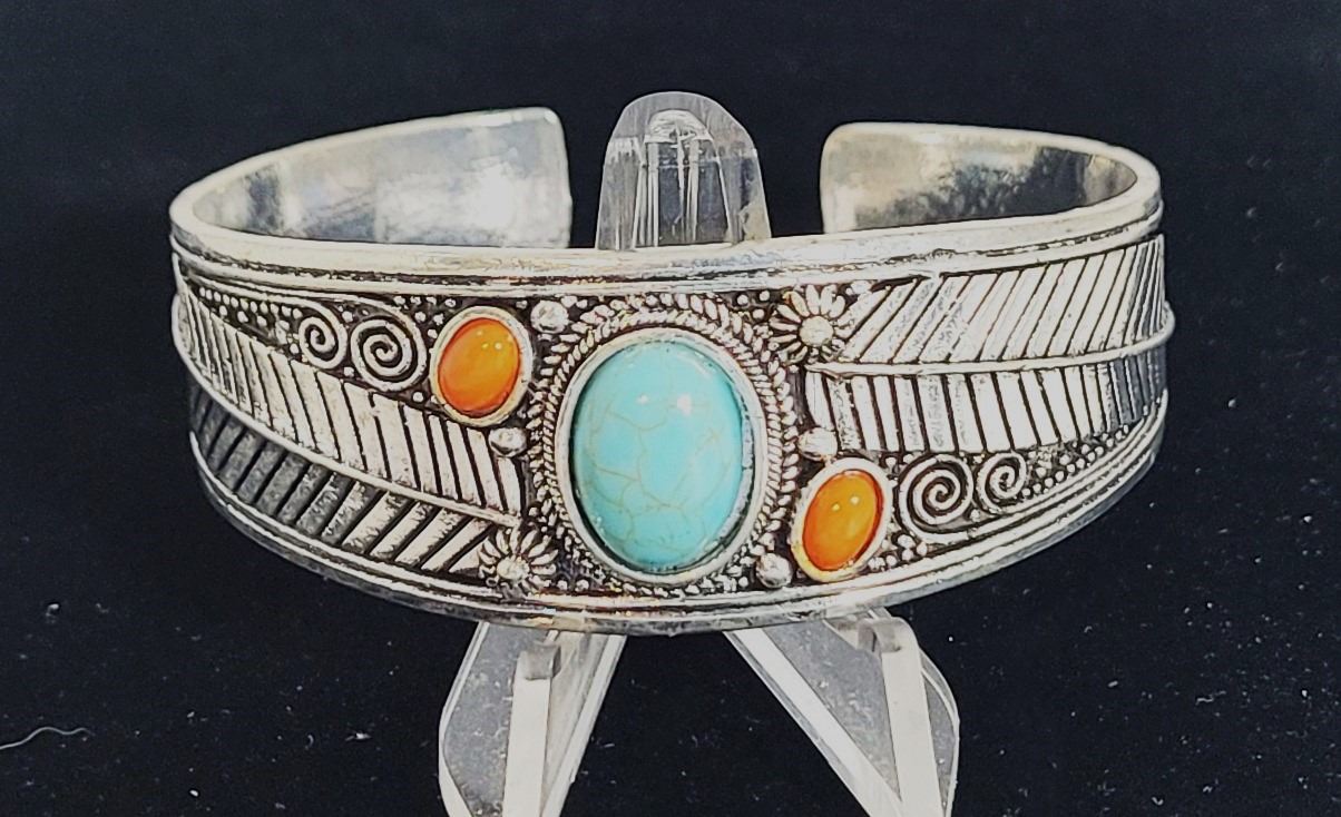 22) TIBETAN SILVER, TURQUOISE AND CORAL CUFF