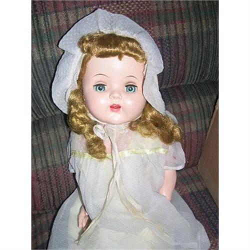 Unmarked 1950's Crier Walker doll (AS IS). Letgs are pin jointed and you can see a split on the one. Doll has cracking in crotch area and was taped at some time. Her wig is great but the ends of the braids need to be rebraided. She has a great face with open and close eyes. She has all of her lashes. She was loved but still looks nice when displayed. Doll is sold as is. Doll comes from a smoke free environment. Buyer to pay $15 for shipping, handling, and insurance. Thanks for viewing.