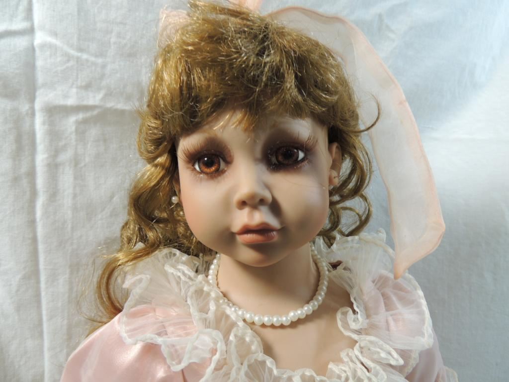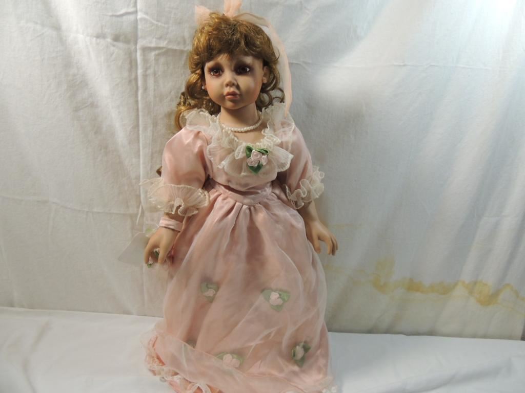 BROWN CURLY HAIR AND BROWN EYES. ON STAND GOOD CONDITION FLOWER DETAILS ON DRESS. AS SHOWN SEE PHOTO FOR MORE DETAILS.