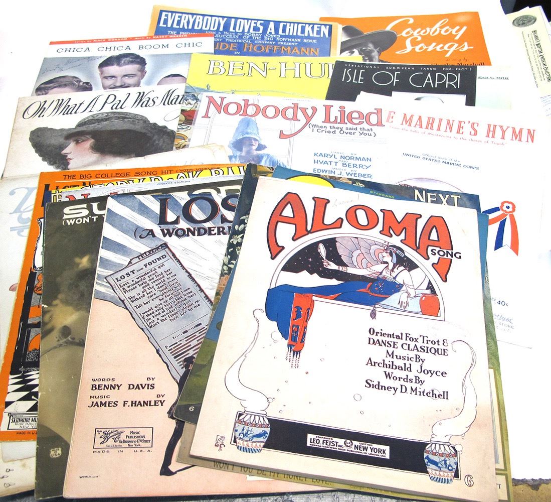 Cowboy Songs by Charles Marshall, Everybody Loves a Chicken by Bobby Jones (everybody really?), Why Can't I Be your Honey Boy by Frank Minzley, Chica Chica Boom Chic by Harry Warren, Oh! What a Pal Was Mary by Edgar Leslie, Ben Hur MGM Pictorial brochure, Isle of Capri by Jimmy Kennedy, The Marine's Hymn, Nobody Lied by Karyl Norman, Aloma Song by Archibald Joyce, Cairo by Arthur Freed, Next Sunday at Nine by Evans Lloyd, Lost(A Wonderful Girl) by Benny Davis, Sun God by Karyl Norman, Nobody Lied by Karyl Norman, The Story Book Ball by Billie Montgomery, Last Night on the Back Porch by Lew Brown, Dance of the Kutie Kids by Chas. Rot, Billy Burn by WB Harvey, Hello Bill by Ernest Nordstrom, Midnight Rose by Karyl Norman, Nobody Lied by Karyl Norman. Date: Location: HWAC # 54646
