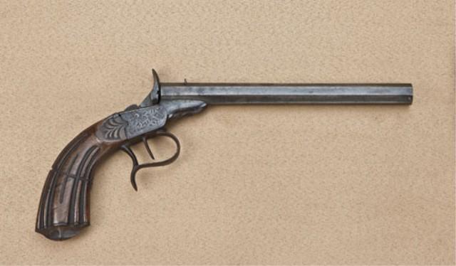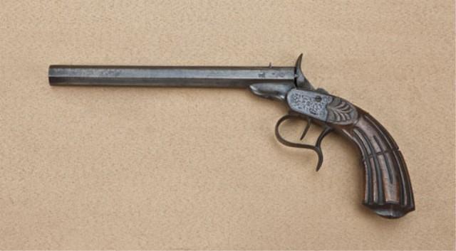 .22 caliber Flobert style single-shot target pistol of belgain manufacture stamped “B.S. Happoldt” on hammer, circa approx. 1855 showing octagon barrel and Belgain proofs. The frame is typically European scroll engraved with fluted French-style grip. The pistol shows serial #4059 and the number 73 engraved at front of frame. The pistol remains in fair to good condition with a brown patina finish, some scattered light to moderate erosion and pinprick pitting. The pistol is well signed on the hammer and the whole signature can be read when cocked. The action is good, the bore is rough. Shown in The Code of Honor: Dueling in America by Ellen N. Murry, which features the collection of Col. Orbelo, page 34. The signature is that of Benjamin Happoldt. From the William R. Orbelo Collection. Est: $1,000 - $2,000