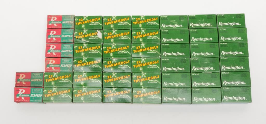 .22 shooters lot of ammunition. Over 2500 rounds of .22 Long Rifle ammunition, primarily Remington Thunderbolt. The lot contains 45 factory boxes and an additional large box of loose pieces with mixed head stamps. Est.: $75-$150.