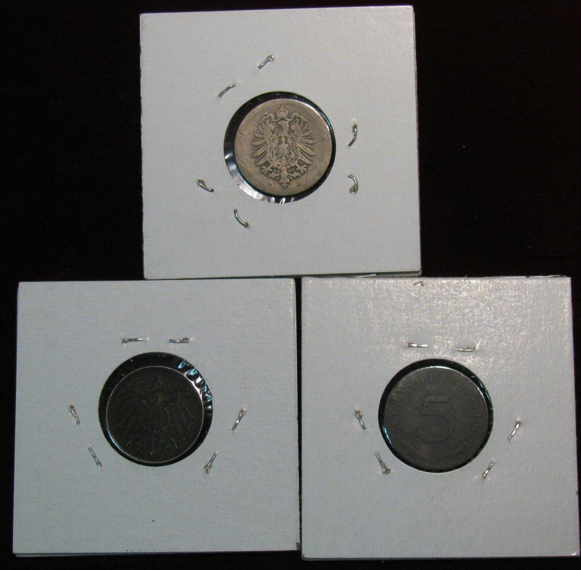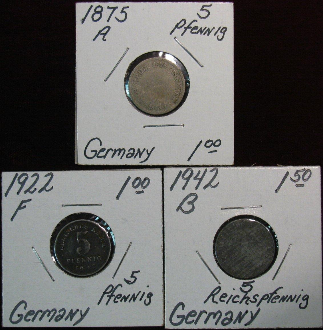 220. Germany 1875A, 1922F & 1942B 5-Pfennig Coins.