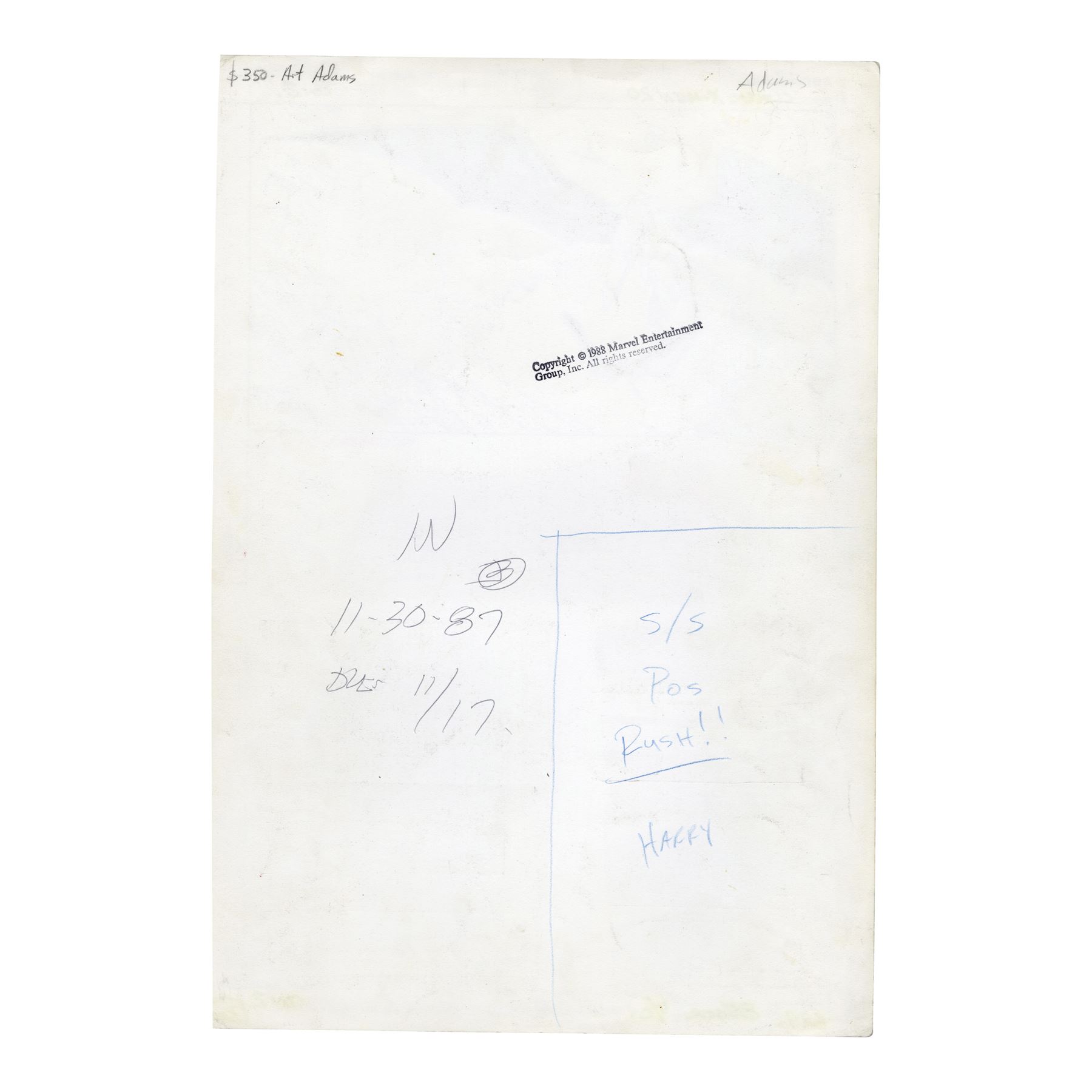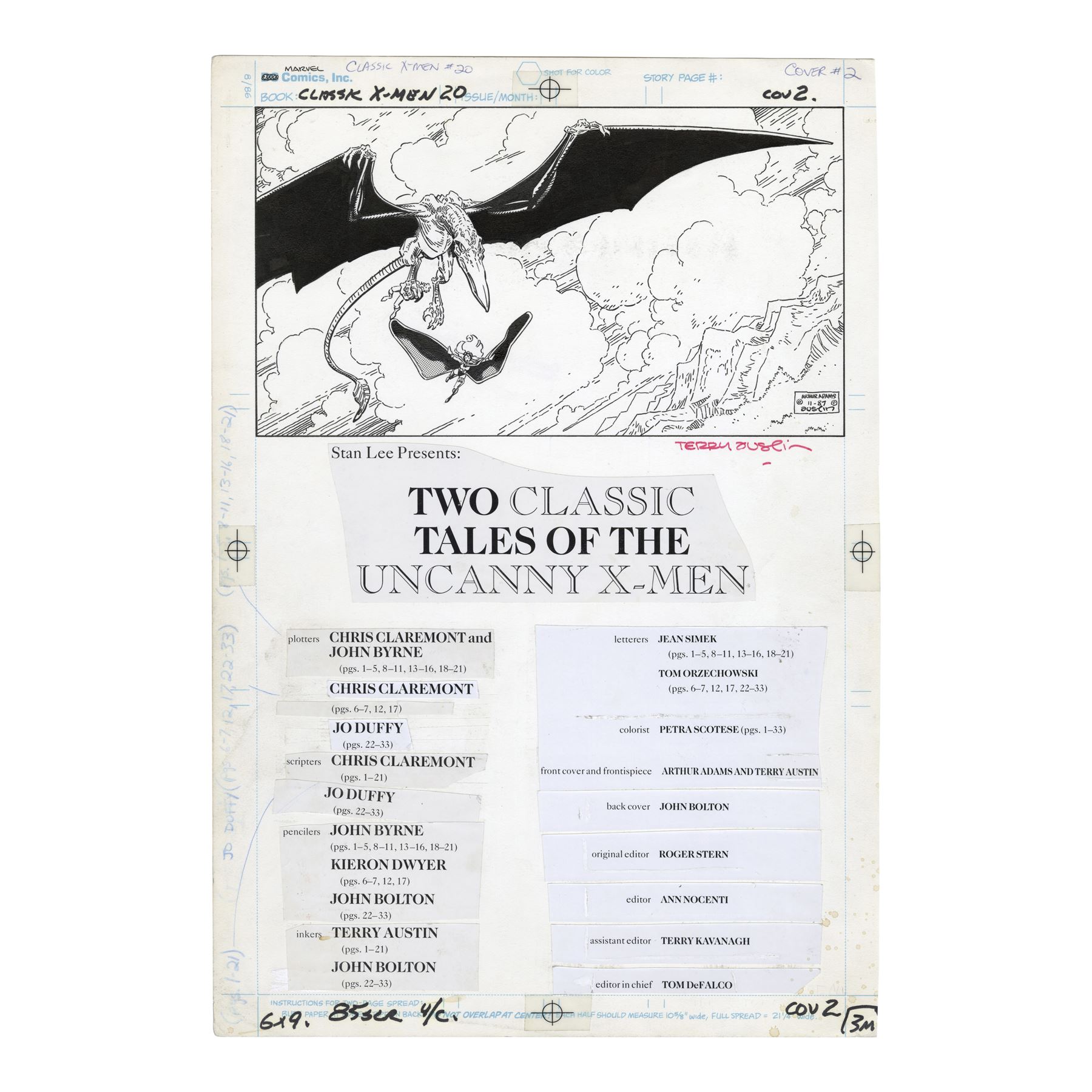 This frontispiece features Storm and Sauron carrying Banshee through the sky in the top graphic, and the information about the publishers, authors, artists, and editors are adhered in sections. The page also features handwritten paginations and measurements, among others. The back of the page features handwritten dates, a memo for a "POS Rush," and a copyright for Marvel Entertainment Group. The bottom of the illustration was signed by Terry Austin in red ink. This lot exhibits discoloration, adhesive residue, and mild creasing from handling. Dimensions: 11.25" x 16.5" (28 cm x 43.25 cm)