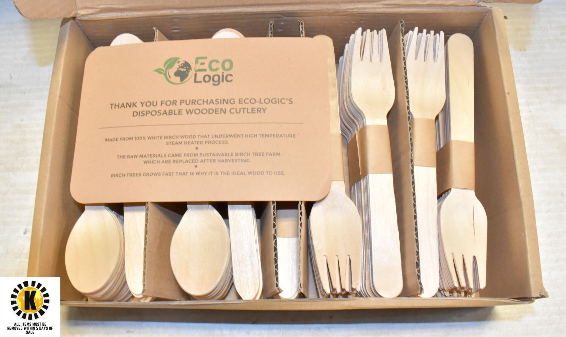 220 PCS ECO LOGIC DISPOSABLE, NON TOXIC, BIODEGRADABLE AND COMPOSTABLE WOODEN CUTLERY. 100 SPOONS, 100 FORKS, 20 KNIVES. ALL ITEMS MUST BE REMOVED WITHIN 5 DAYS OF SALE