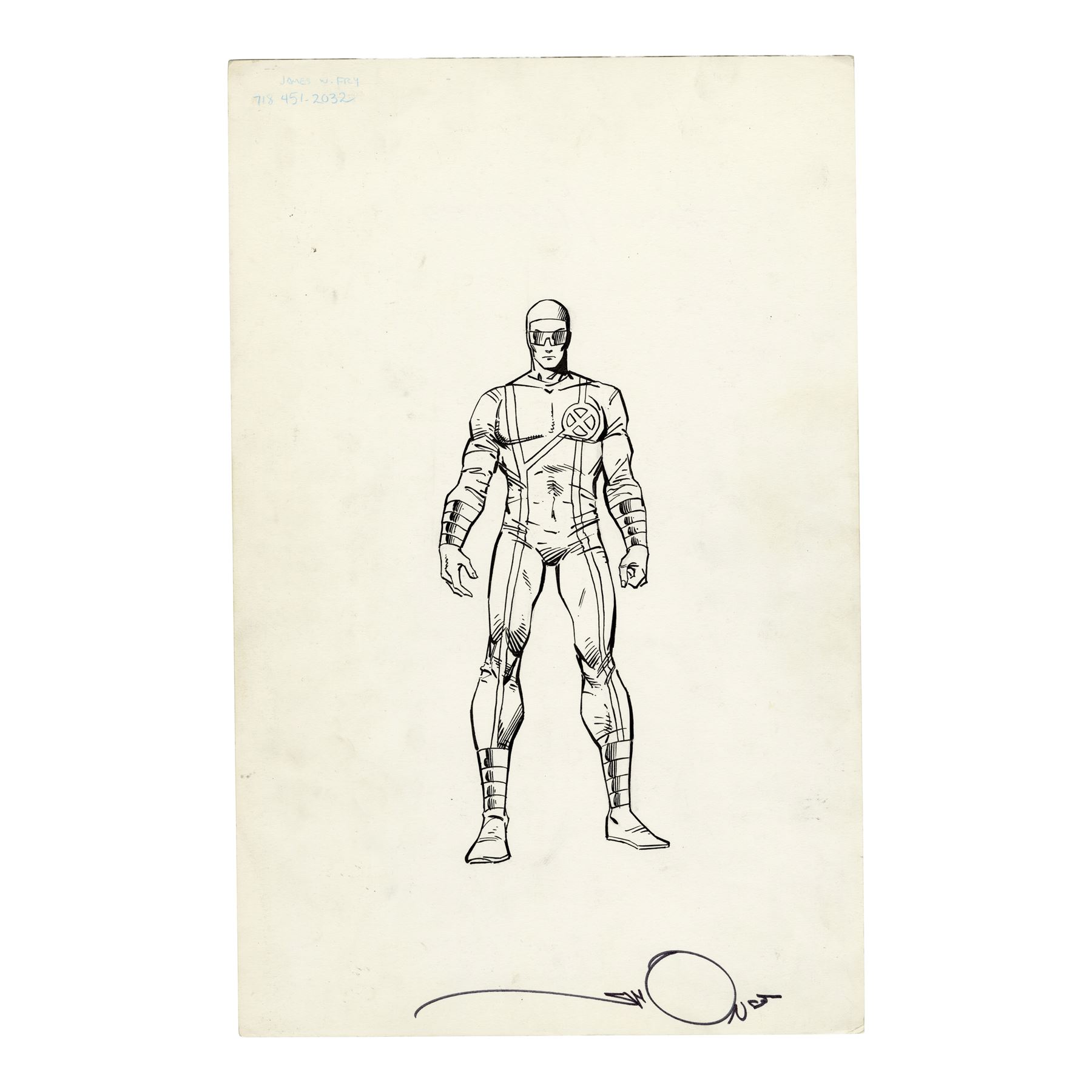 MARVEL COMICS - Hand-Drawn Walt Simonson and Joe Rubinstein Official Handbook of the Marvel Universe Deluxe Edition No. 15 Cyclops Illustration - An illustration of Cyclops hand-drawn by comic artists Walt Simonson and Joe Rubinstein for the Official Handbook of the Marvel Universe Deluxe Edition No. 15. Published by Marvel Comics, cover date March 1986, after the success of the original issue's 1984 publication, the issue featured pages by a variety of Marvel artists, including an X-Factor listing for Cyclops.