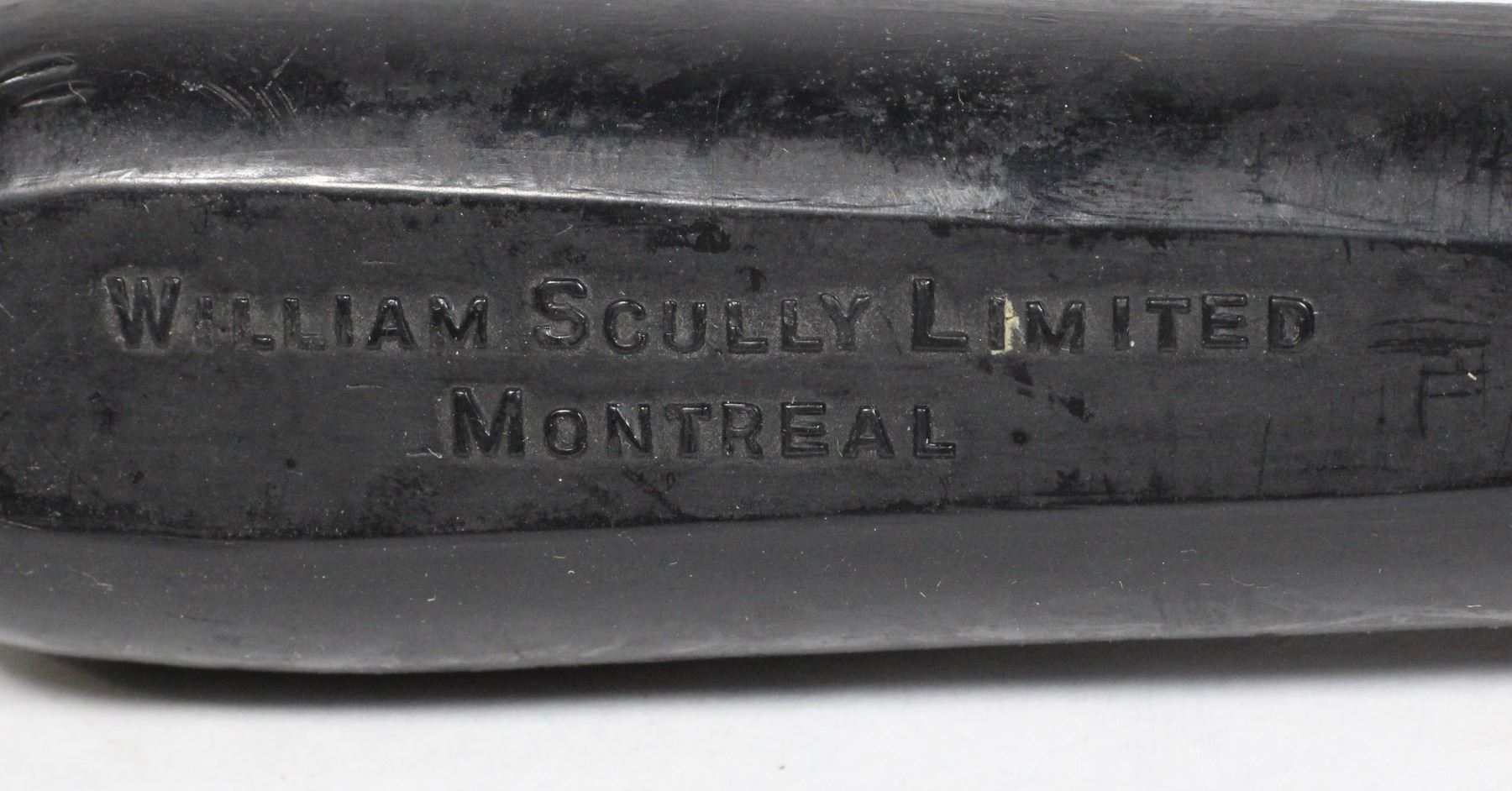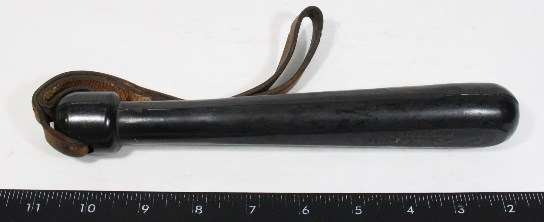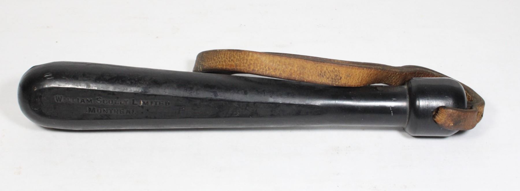 LEGAL TO DISPLAY IN COLLECTION, MEASURES 9 INCHES LONG. MARKED "WILLIAM SCULLY LIMITED MONTREAL", RUBBER CONSTRUCTION WITH LEATHER STRAP. EARLY 20TH CENTURY LAW ENFORCEMENT POLICE CANADA CANADIAN