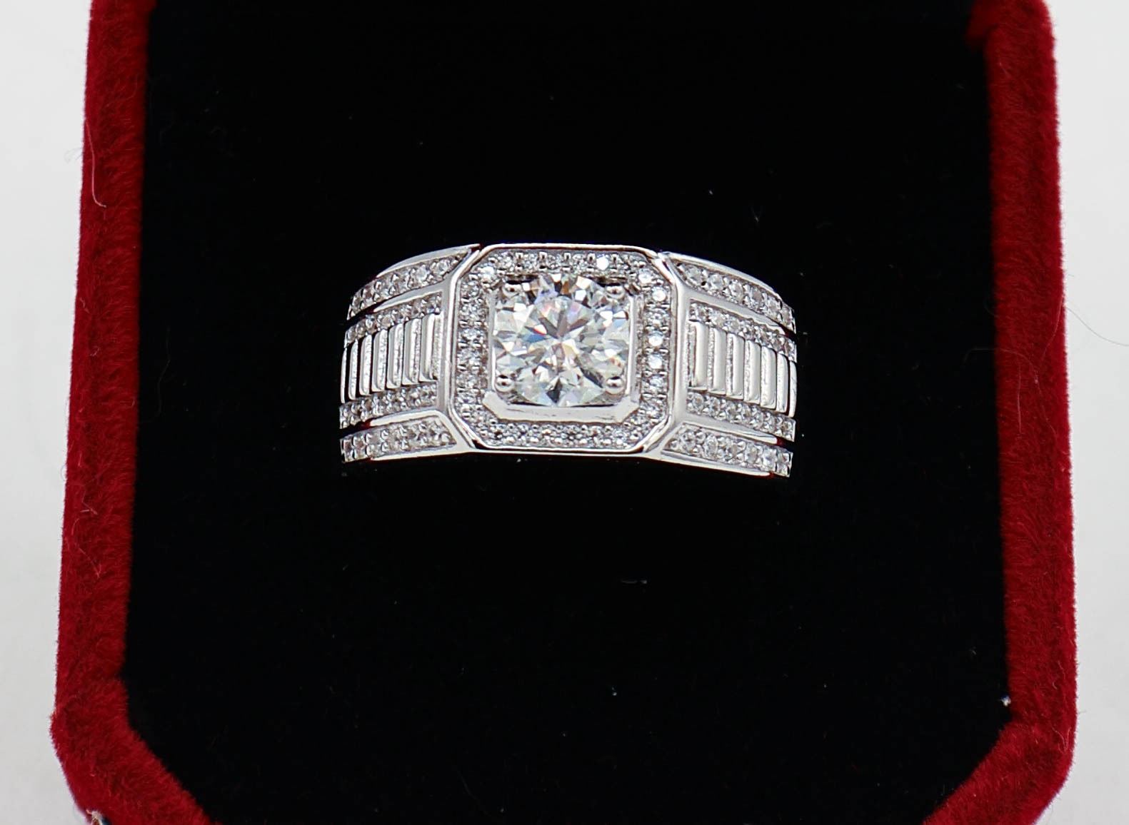 CUT MOISSANITE STONE VVS D COLOR SET IN CENTER OF SQUARE HALO WITH TOTAL 84 ROUND CUT CUBIC ZIRCONIA ALSO SET IN BOTH SHOULDERS SET IN 925 SILVER RING SIZE 11 RETAIL VALUE $1,200.00 **ALL ITEMS MUST BE REMOVED BY 5PM SATURDAY, FEBRUARY 22ND 2025. ALL REMAINING ITEMS WILL BE SUBJECT TO A $6.00 PER DAY STORAGE CHARGE. ANY ITEMS REMAINING AFTER MONDAY, MARCH 10TH 2025 WILL BE CONSIDERED FORFEITED. NO REFUNDS WILL BE ISSUED FOR FORFEITED ITEMS. TO SCHEDULE A PICK UP APPOINTMENT CLICK HERE